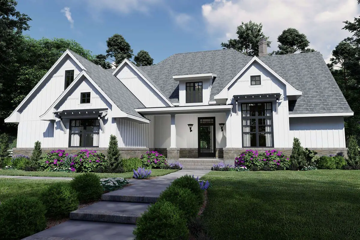 This modern farmhouse plan blends timeless style with functional everyday living. Designed as a single-story home with approximately 2,191 square feet of heated space, it includes four bedrooms and four full bathrooms—each thoughtfully placed to support privacy and ease of use.