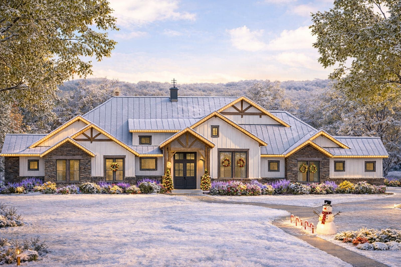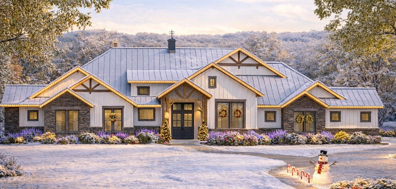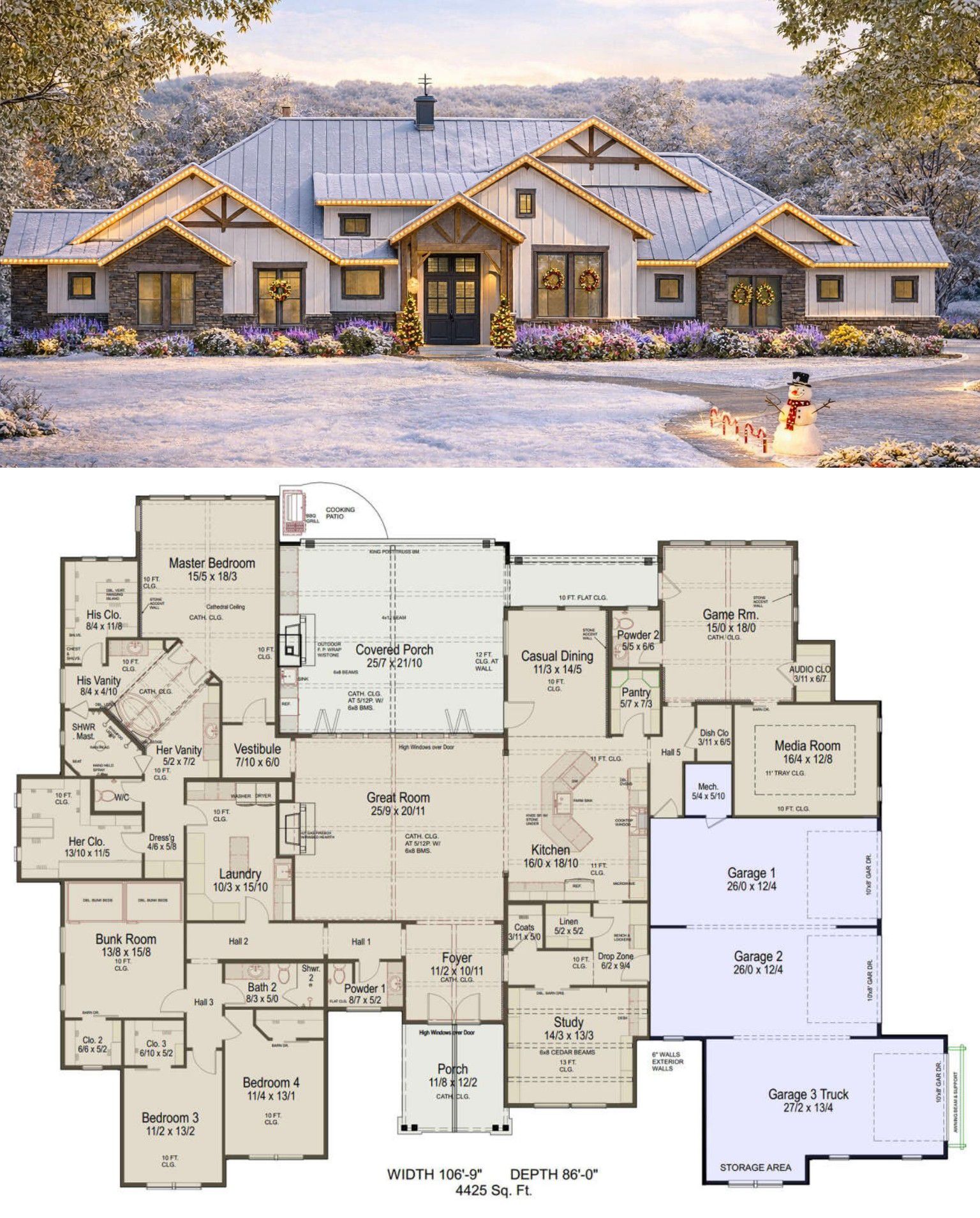 The exterior combines modern transitional details with classic proportions. Clean rooflines, balanced gables, and layered materials create an attractive façade. The wide footprint of about 106′-9″ and depth of 86′ gives the home a substantial presence while still feeling welcoming. 1