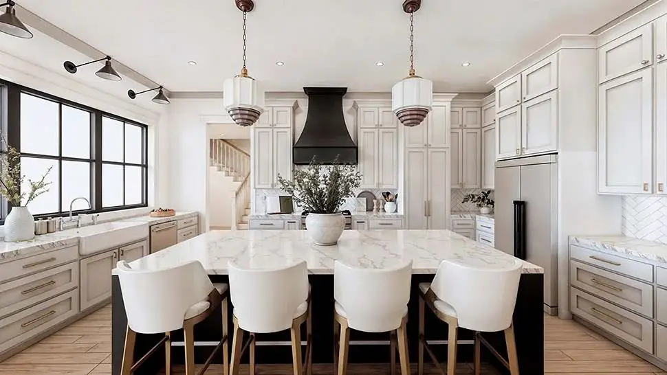 This impressive New American farmhouse blends contemporary style with classic farmhouse elements.