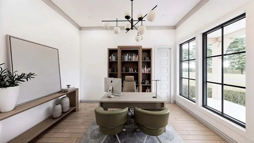 Plan 84702 incorporates numerous thoughtful touches like a front home office with a hidden safe, a mudroom with convenient drop zones, and a pantry that keeps everyday kitchen storage organized.