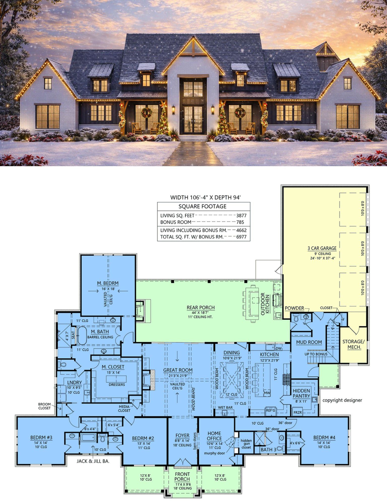 With approximately 3,877 square feet of heated living space, four bedrooms, three full bathrooms, one half bath, and a generous three-car garage, Plan 84702 delivers luxury, comfort, and everyday livability all in a thoughtfully balanced layout.