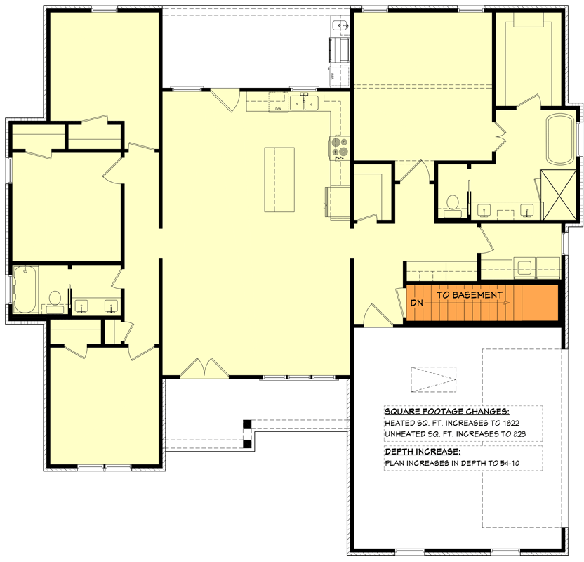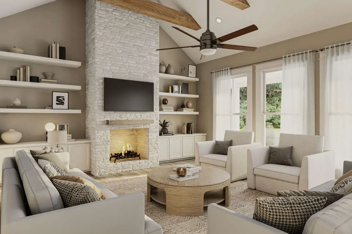 The exterior presents a transitional modern farmhouse look, blending clean lines with subtle cottage and country elements. A welcoming 5′-deep front porch invites you into the home, while an 8′-deep rear porch extends your living outdoors and even offers space for an optional outdoor kitchen.