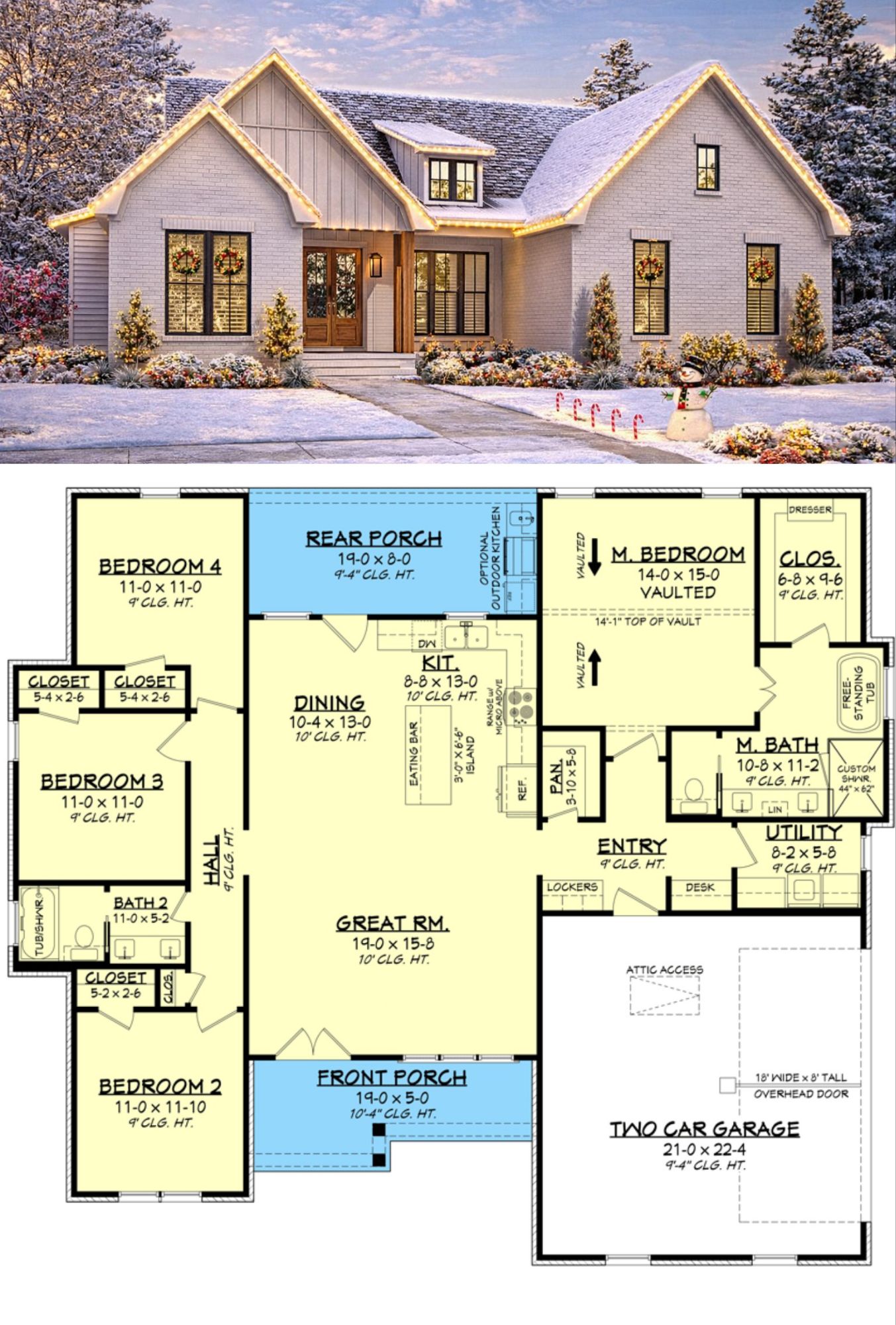 This transitional farmhouse plan is built for lifestyle flexibility. The open layout keeps the living and dining spaces connected and bright, while the split bedroom arrangement enhances privacy when needed. The vaulted master suite adds a spacious, refuge-like feel without expanding the home’s footprint. 20