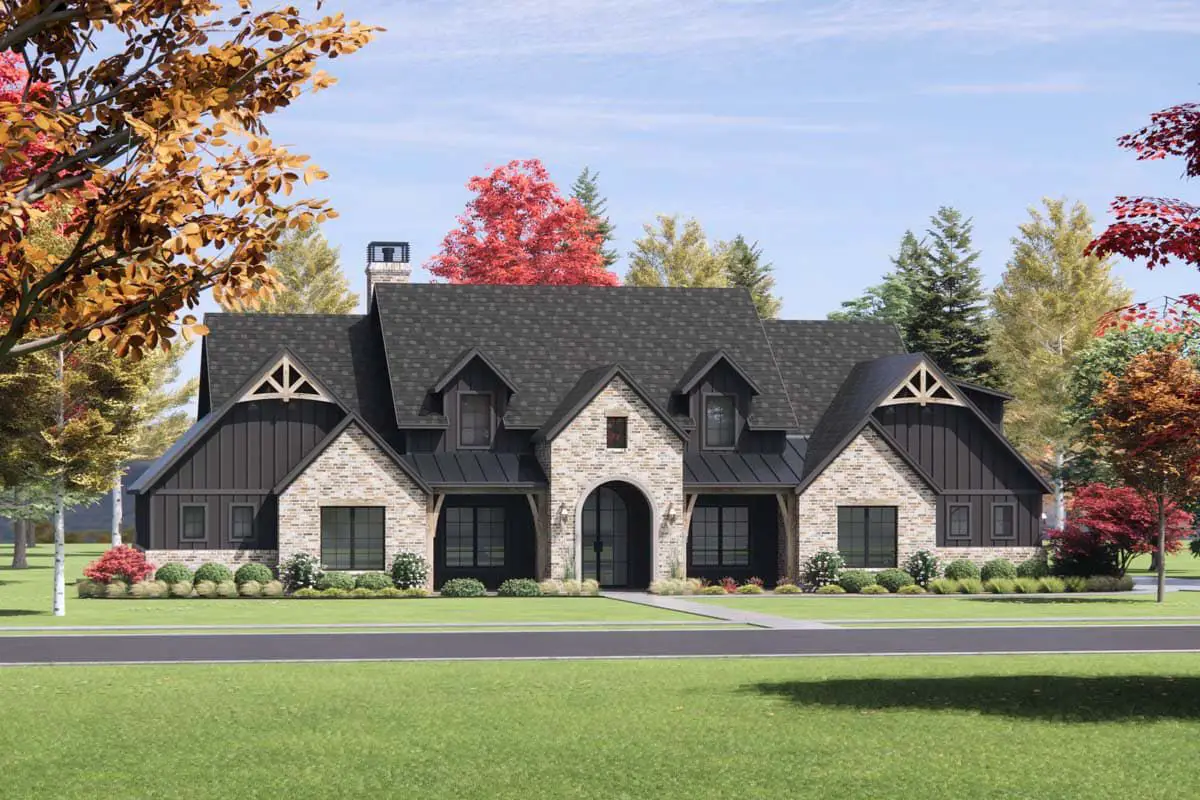 The exterior showcases perfect symmetry with balanced gables, a mix of brick, wood, and metal finishes, and a welcoming covered front porch. A pair of arched French doors with sidelights opens into the foyer, creating an inviting first impression.