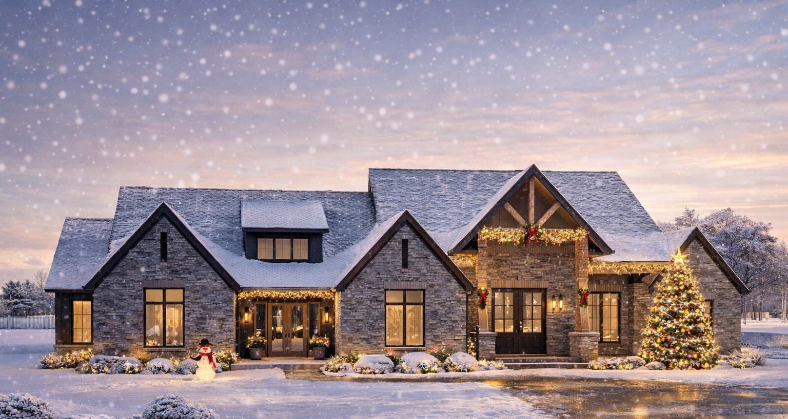 The exterior combines modern and cottage elements with high roof pitches, dark contrasting finishes, and a mix of thinset stone and board-and-batten siding for a striking yet welcoming façade. A covered front porch creates a warm entry point and sets the tone for the home’s inviting character.