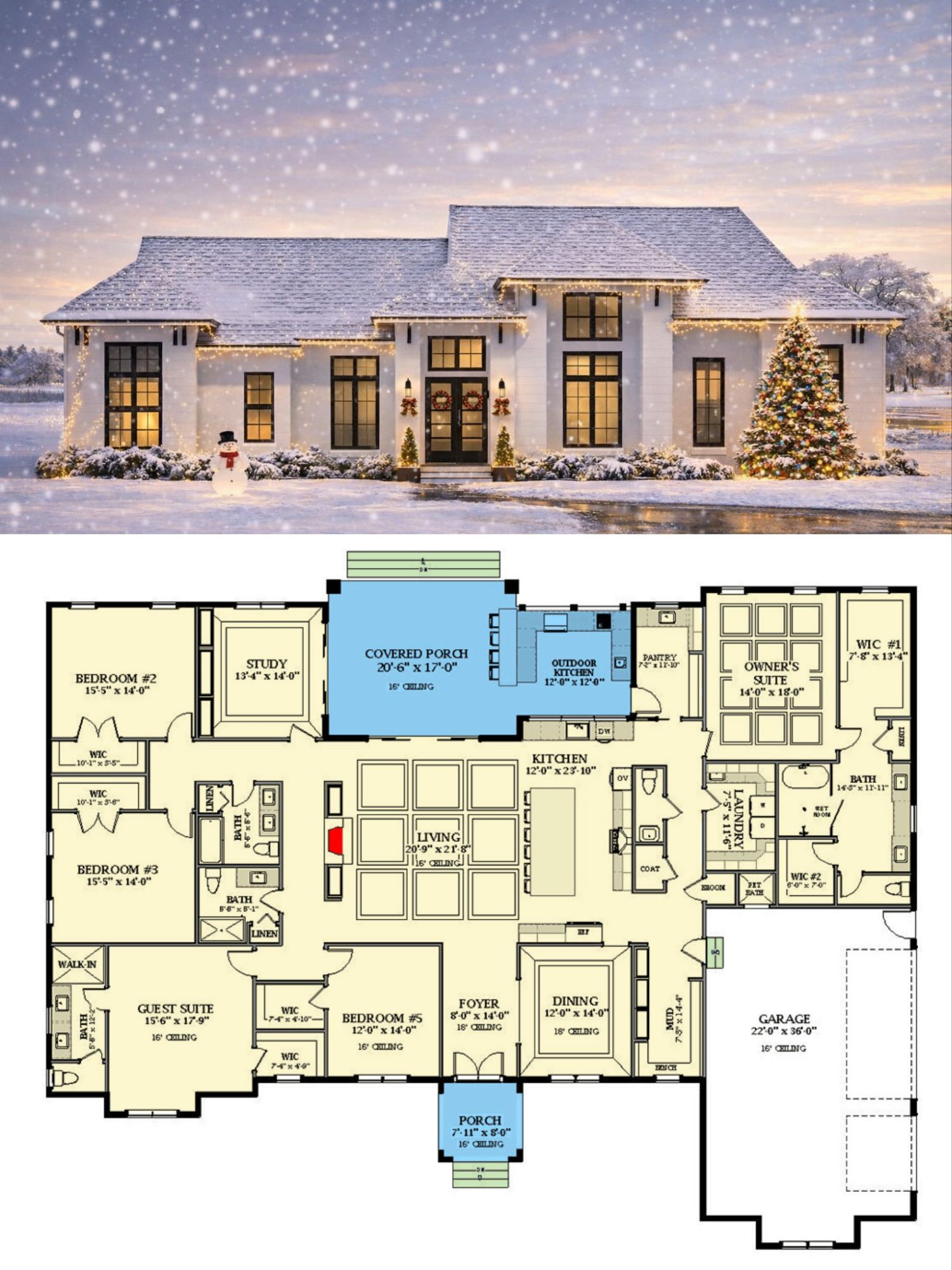 This elegant Southern transitional home plan blends refined design with everyday livability. With about 4,027 square feet of heated space, the layout provides 5 bedrooms, 3 full bathrooms plus 2 half baths, a spacious three-car garage, and premium indoor-outdoor living features—including an outdoor kitchen and covered porch spaces—ideal for family life and entertaining.