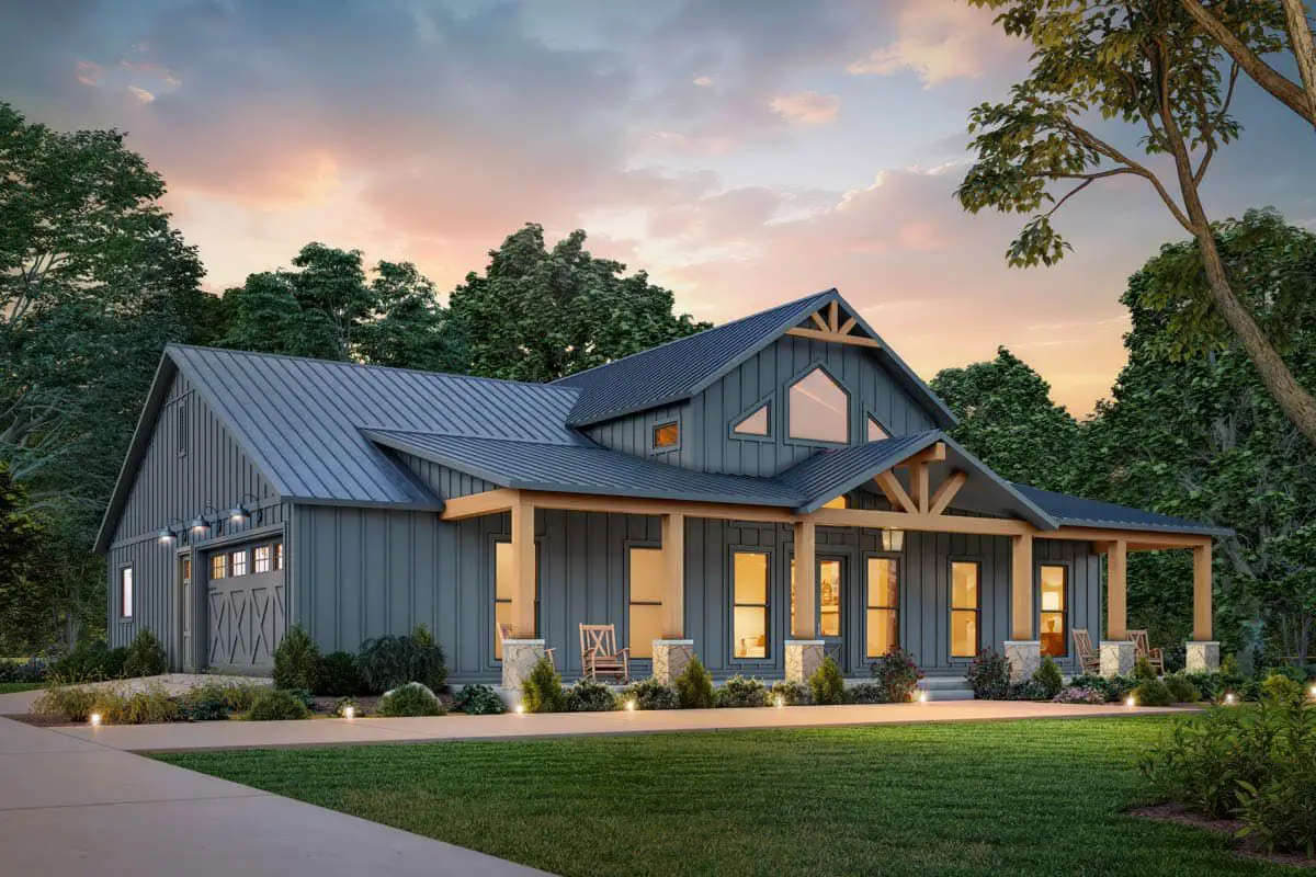 From the street, the shape feels modern and farmhouse-friendly at the same time—simple rooflines, crisp detailing, and a “come on in” front porch that practically begs for a couple rocking chairs and a mug of something warm. The overall footprint is nicely balanced, with the garage set to the side so the house (not the garage doors) gets the spotlight.
