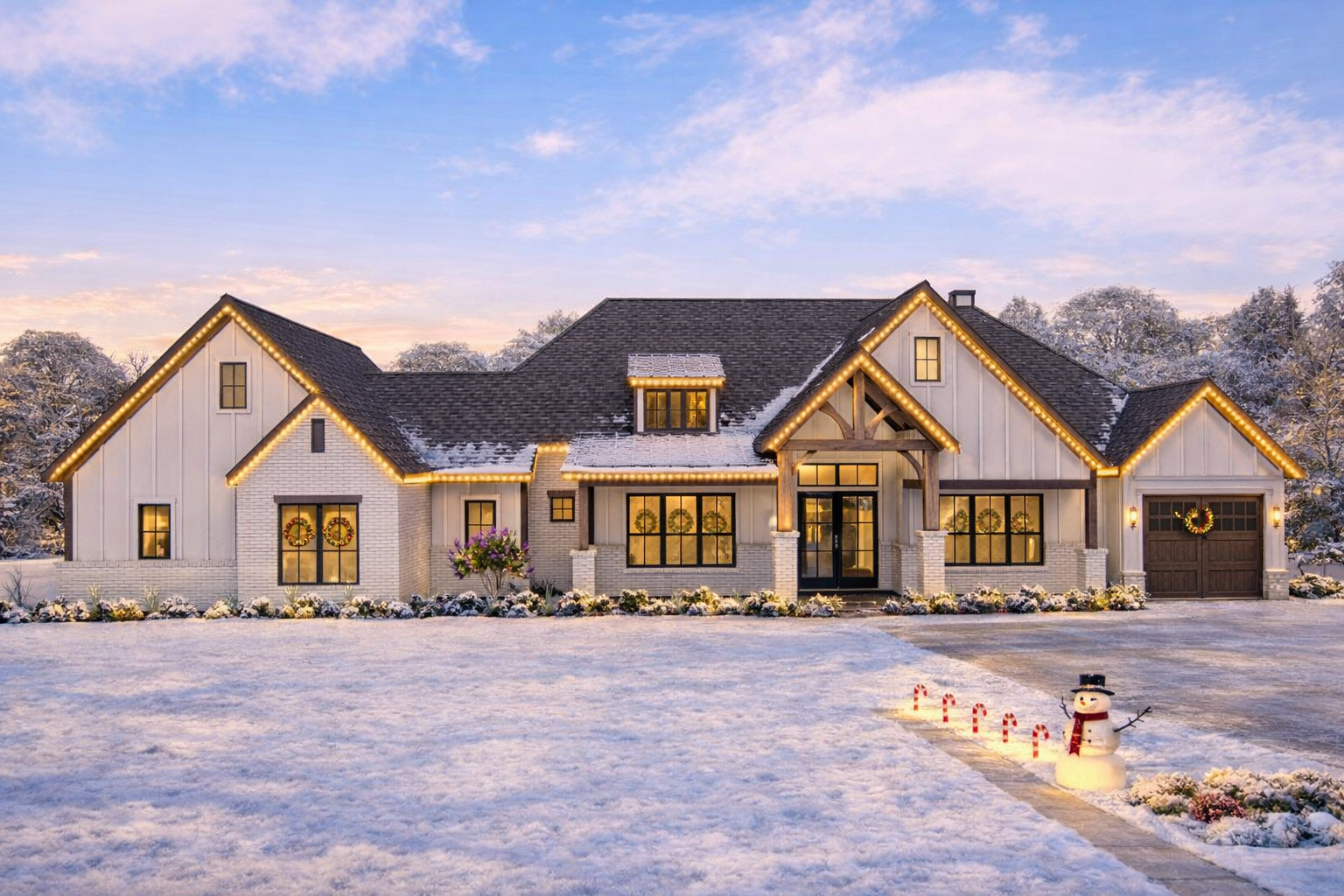 The façade blends classic Craftsman and New American elements with painted brick, board-and-batten siding, and prominent wood timbers that create a warm yet sophisticated presence. A covered front porch welcomes guests and enhances curb appeal.