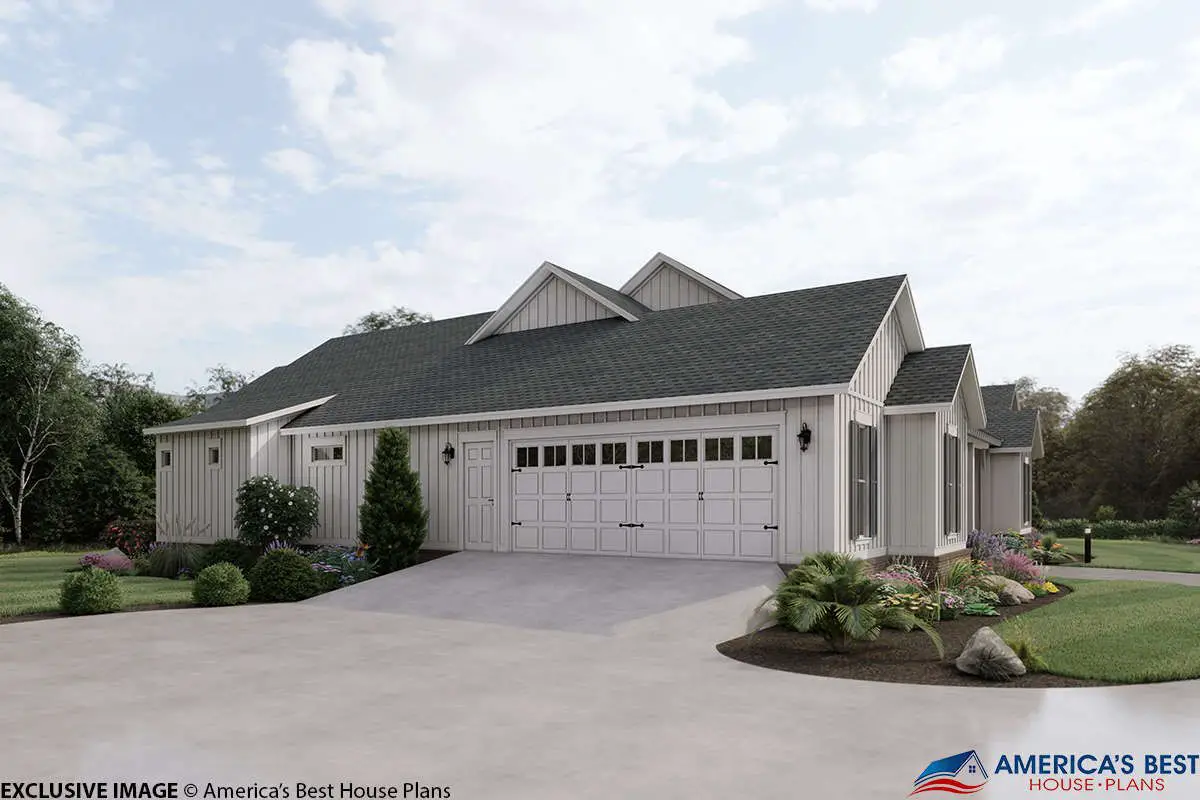 Triple front door entryways and architectural lighting details enhance the curb appeal, giving this plan an approachable yet refined look.