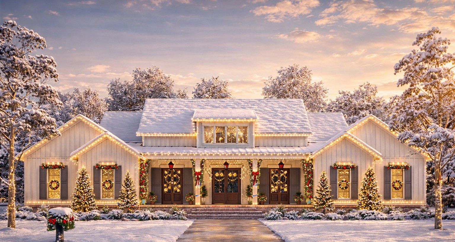 The home’s exterior features classic modern farmhouse styling with a symmetrical façade, board-and-batten siding, and a welcoming covered front porch.