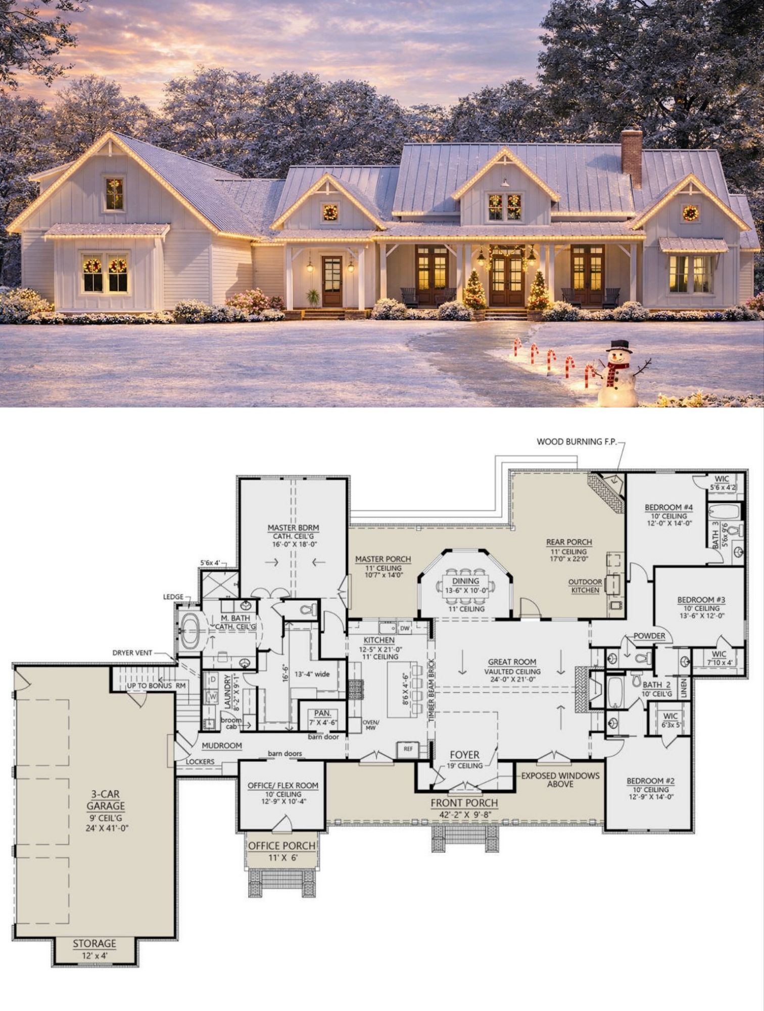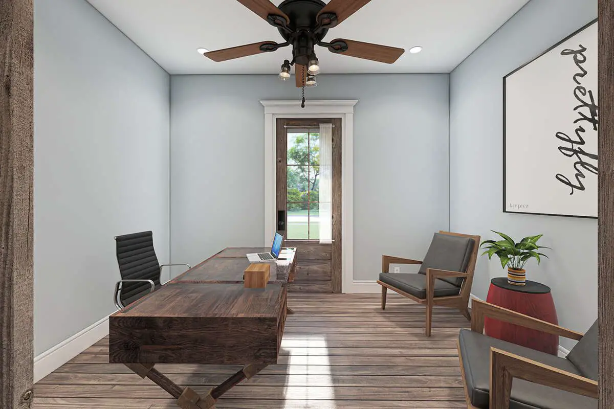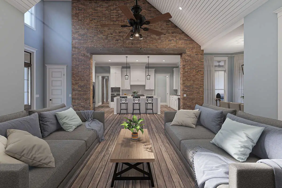 This modern farmhouse plan offers an inviting layout that supports everyday living, entertaining, and flexible working spaces. The vaulted great room and open kitchen create a natural hub for family interaction, while the owner’s suite and separate secondary bedrooms provide peaceful retreats. Outdoor living spaces extend your home’s usable area for year-round enjoyment. 12