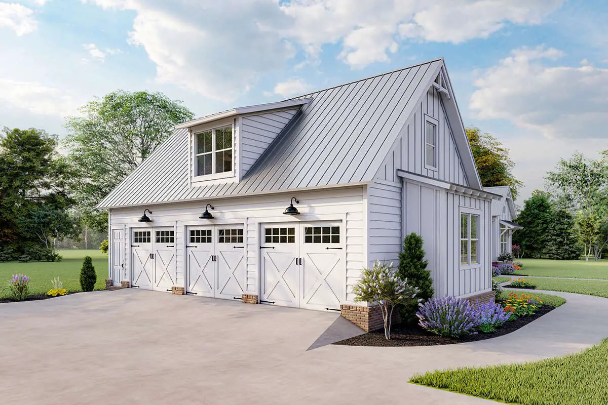A three-car garage (~1,118 sq ft) provides ample parking and storage, with a convenient bump-out space for lawn equipment and tools.