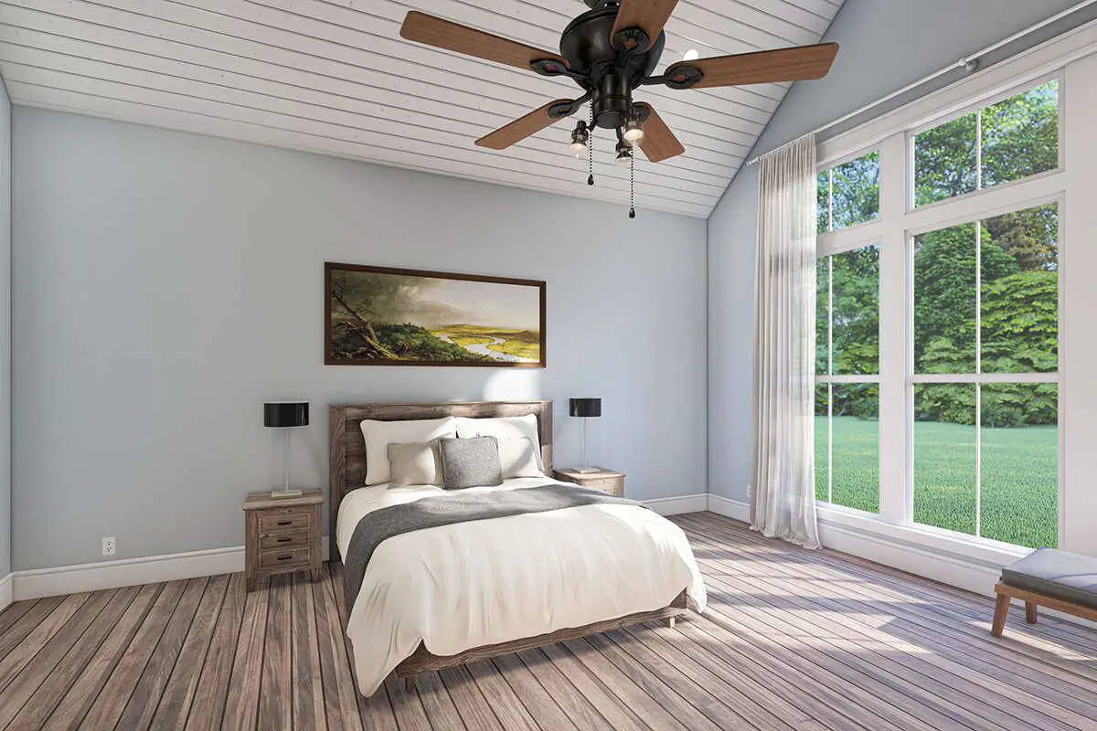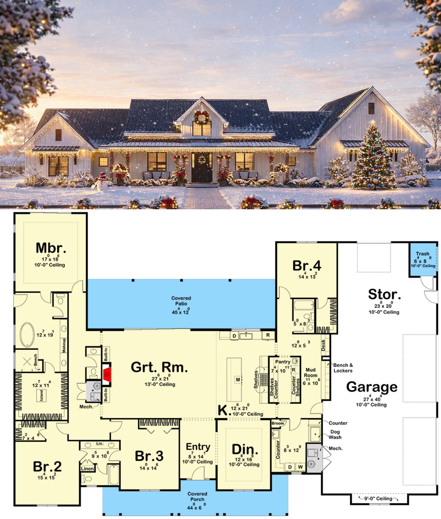 This modern farmhouse plan is designed for both relaxed everyday living and entertaining. The open layout encourages family interaction, while the thoughtful separation of private spaces ensures comfort and quiet when needed. The large workshop and four-car garage provide flexible space for vehicle storage, hobbies, or practical projects. 11