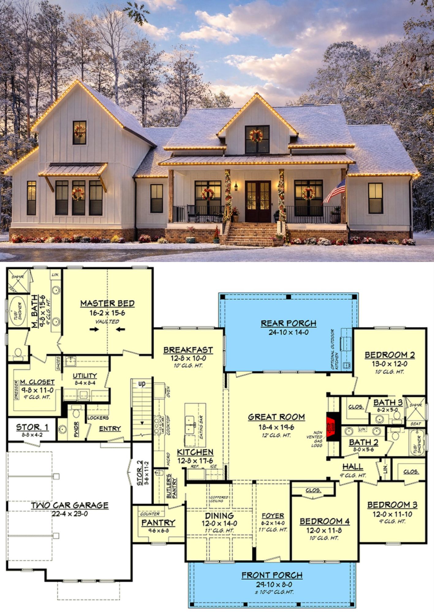 This stylish modern farmhouse plan offers an open, functional layout coupled with classic farmhouse charm and flexible living spaces.