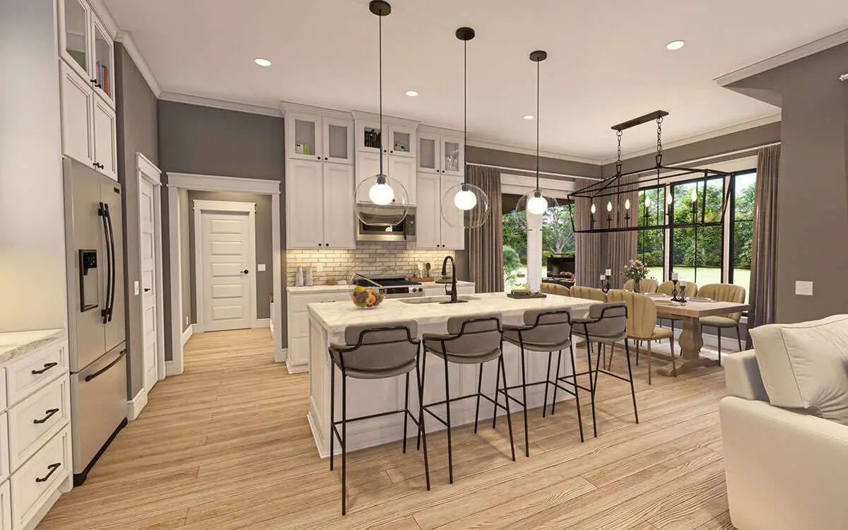 The kitchen features a large island with seating—perfect for meal preparation, casual dining, and conversation. Counter space and storage are generous, and the layout supports efficient workflow.