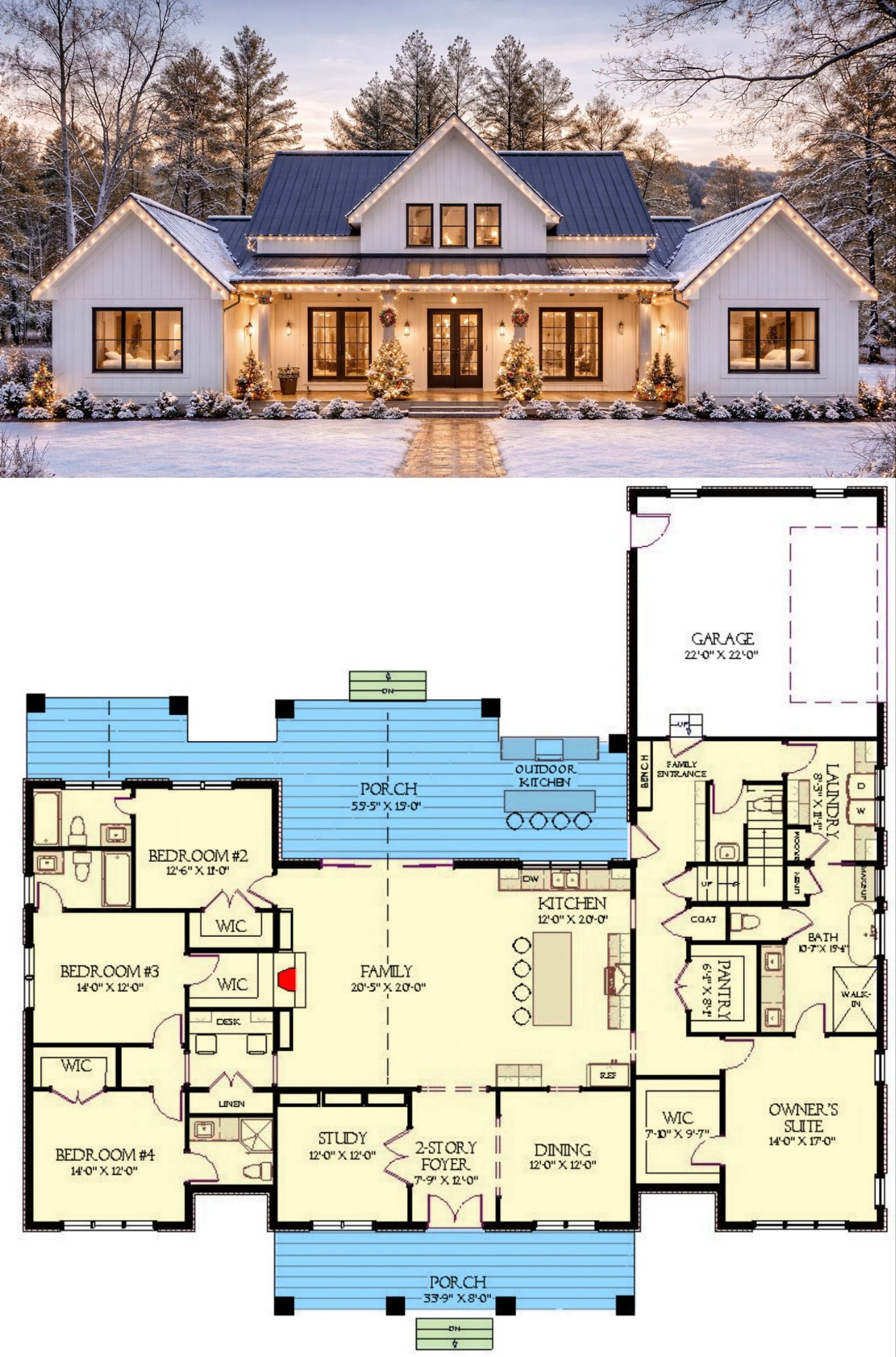 This modern farmhouse plan combines contemporary farmhouse style, thoughtful living spaces, and a focus on indoor-outdoor living.
