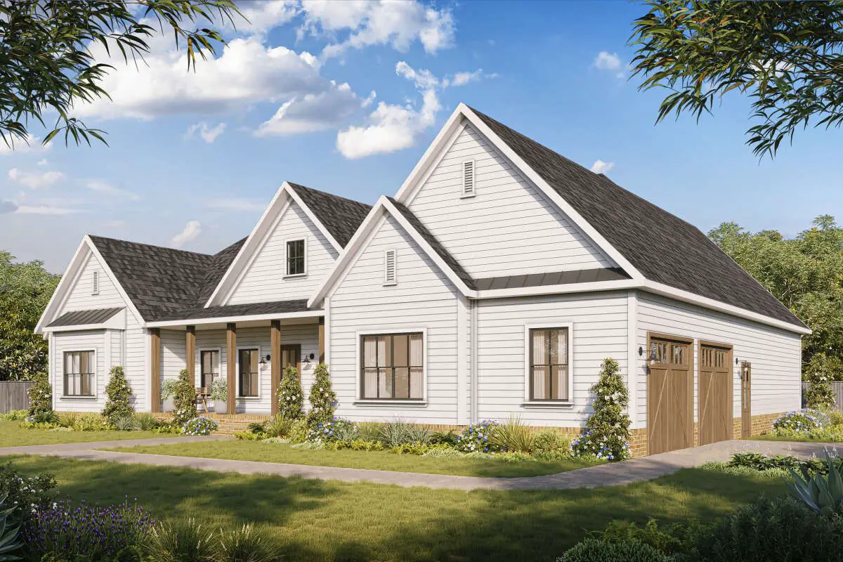 The exterior showcases attractive modern farmhouse styling with clean lines, board-and-batten siding, and multiple gables for visual interest. A covered front porch provides a welcoming entry point and enhances the home’s curb appeal.