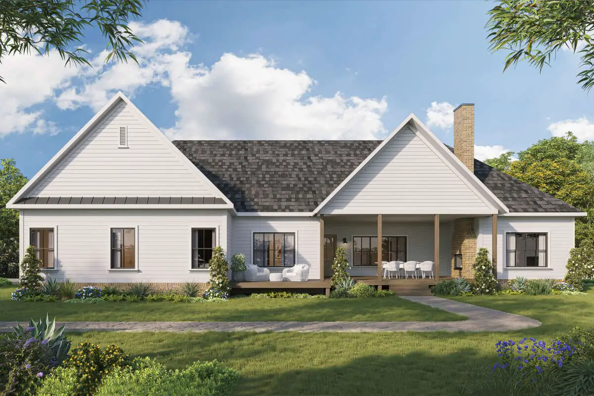 This modern farmhouse plan supports comfortable everyday living with open shared spaces and well-placed private retreats. The thoughtful bedroom layout—with all bedrooms having access to full bathrooms—enhances convenience for family members and guests. Practical circulation and storage areas like the mudroom and walk-in pantry help keep daily routines running smoothly, while the rear porch invites you to enjoy outdoor living year-round.