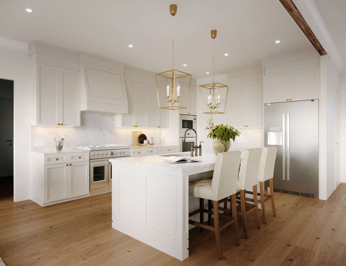 The kitchen features a central island with seating, providing space for casual meals, homework, or socializing while cooking. With ample countertop space, storage, and a walk-in pantry, this kitchen balances everyday functionality with aesthetic appeal.