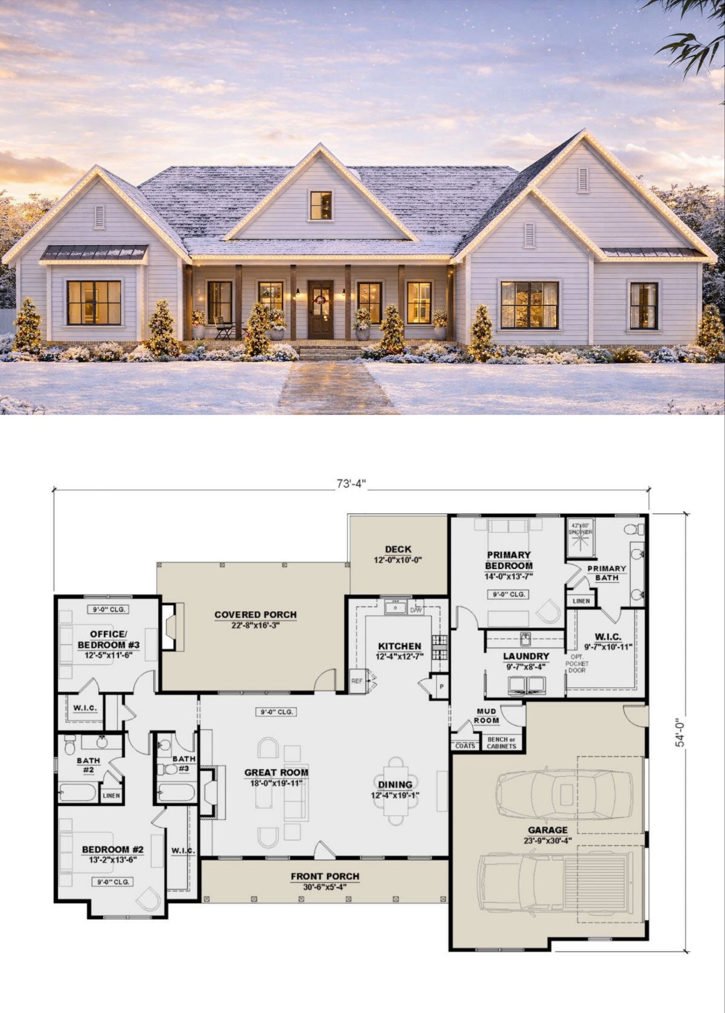 This modern farmhouse design combines contemporary style with practical family-friendly living in a thoughtfully arranged one-story layout.