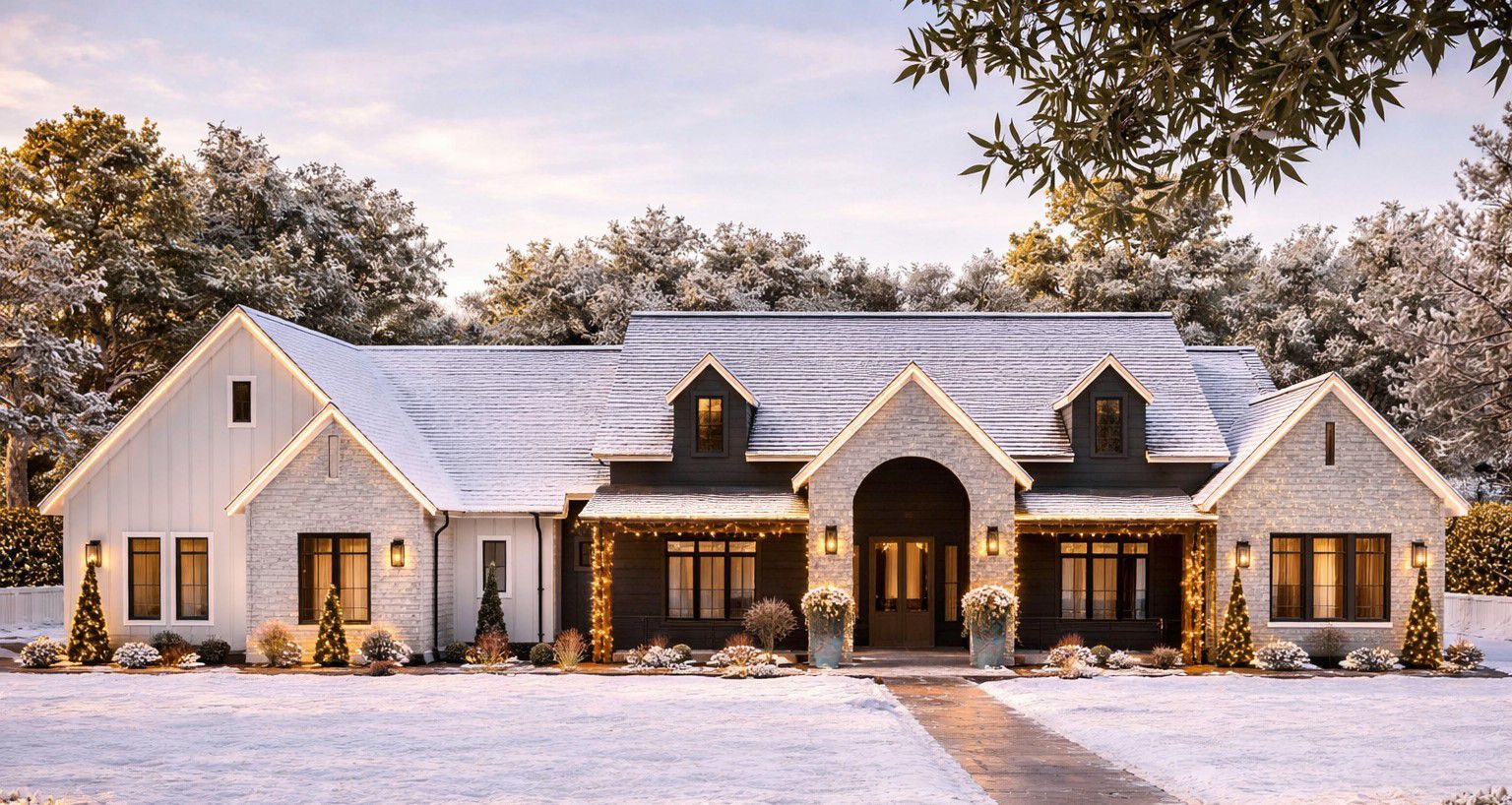 The exterior blends modern farmhouse clean lines with inviting architectural elements. Board-and-batten siding and a balanced façade create strong curb appeal, while a covered front porch adds welcoming charm.