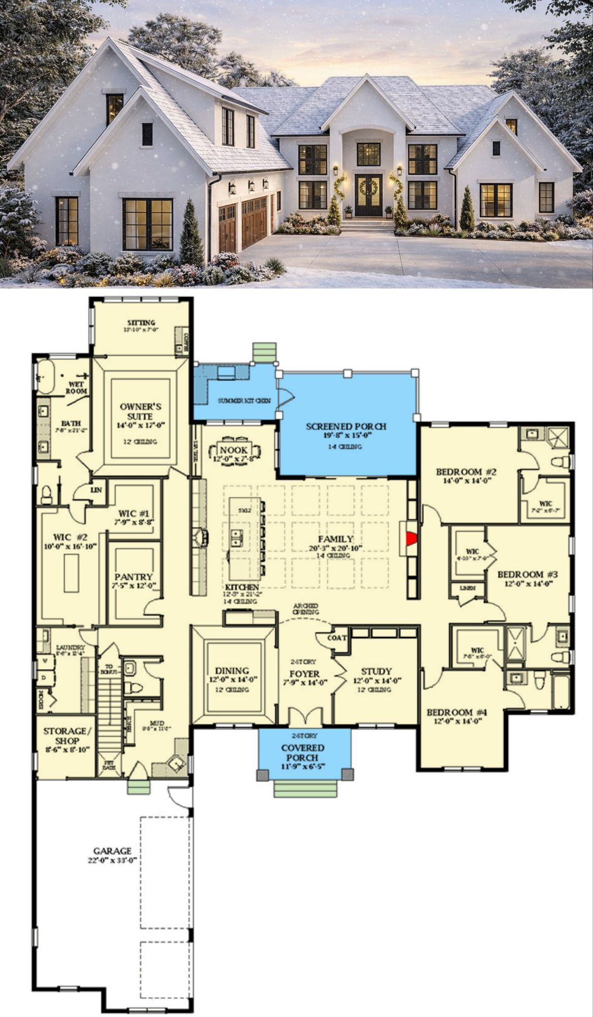 This transitional home plan offers a thoughtful balance of shared and private spaces. Open main living areas foster connection, while strategically placed bedrooms and flexible bonus space accommodate family needs and guest visits. The inclusion of multiple outdoor living spaces enhances opportunities for relaxation and entertaining. With amenities like a butler’s pantry, workshop, screened porch, and expansive bonus area, this design provides both luxury and practicality for modern living. 9
