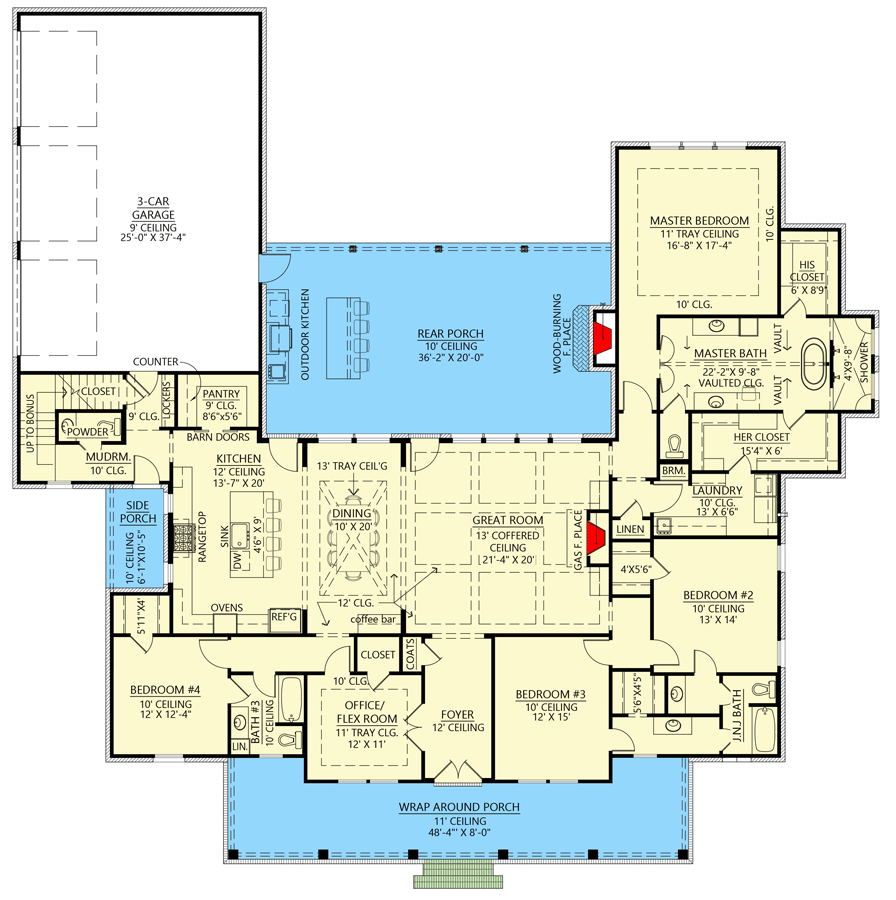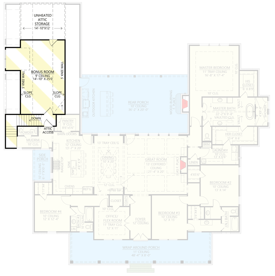 This farmhouse plan supports everyday family life with open common areas that encourage connection and private bedroom zones that offer peaceful retreats. The dedicated office/flex room adds versatility for modern lifestyles, while generous porch spaces expand your living area outdoors. Practical features such as the walk-in pantry, mudroom with lockers, and laundry access from the suite help streamline daily routines. 20