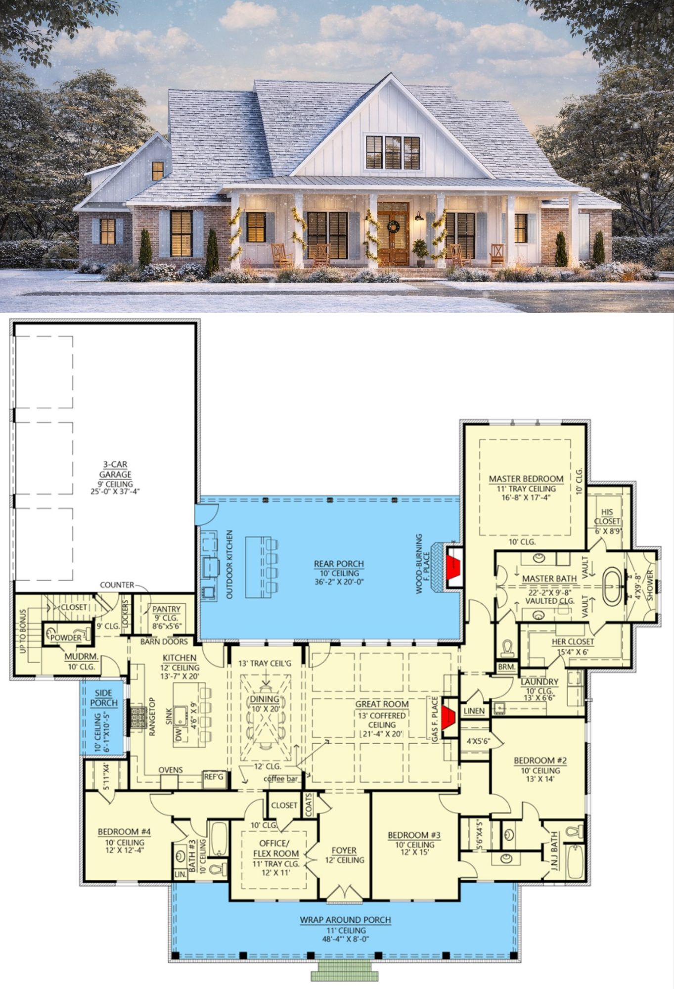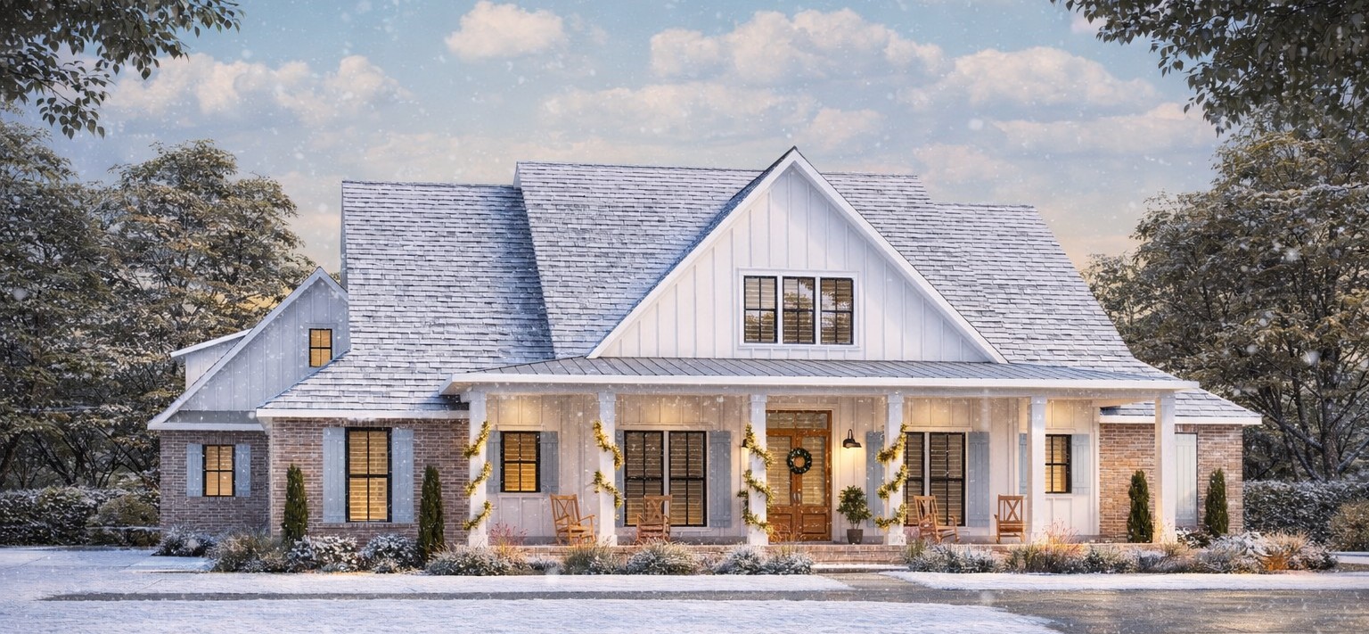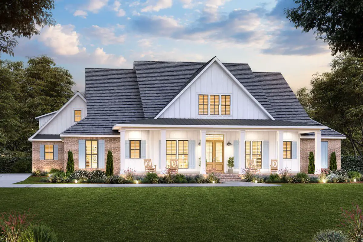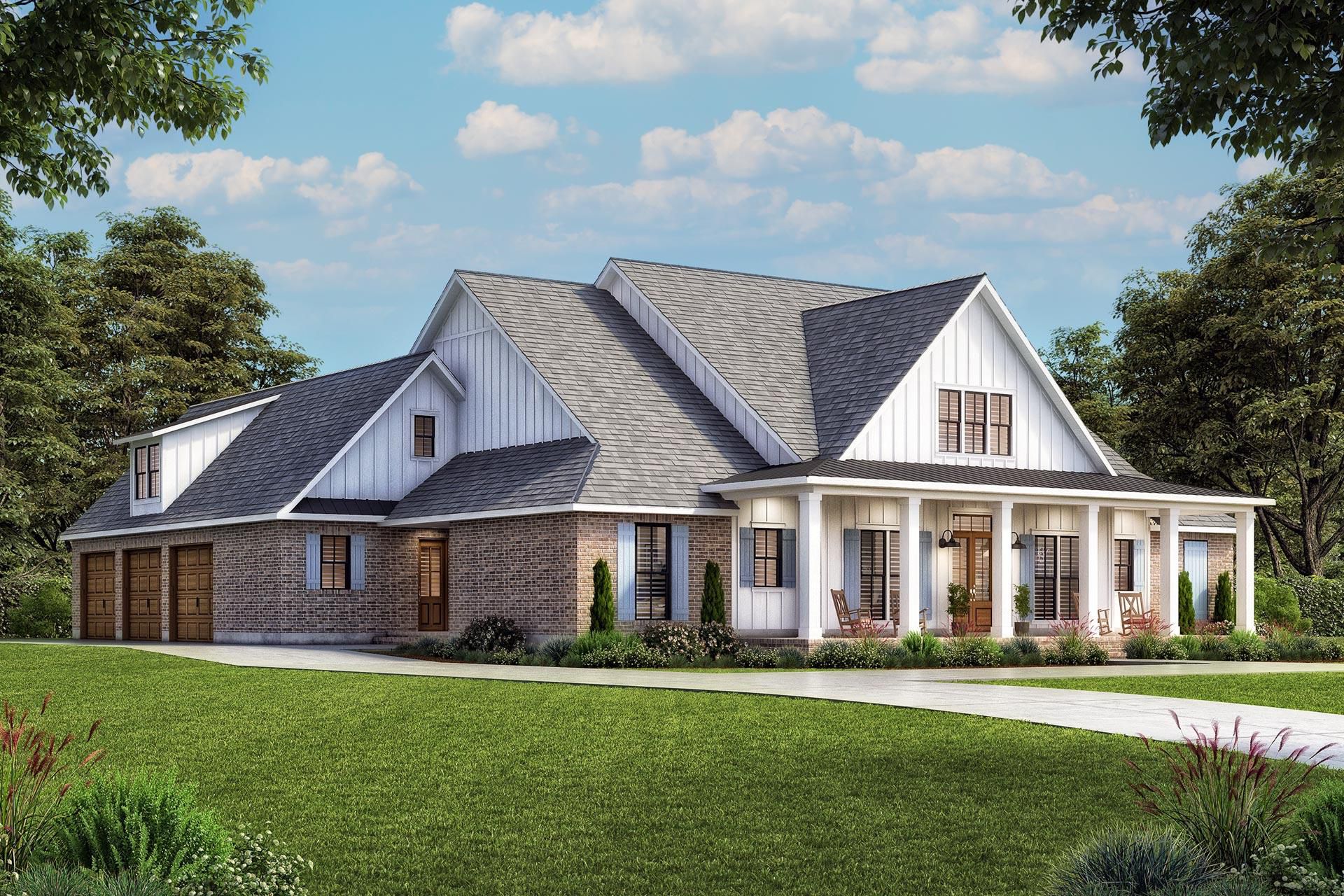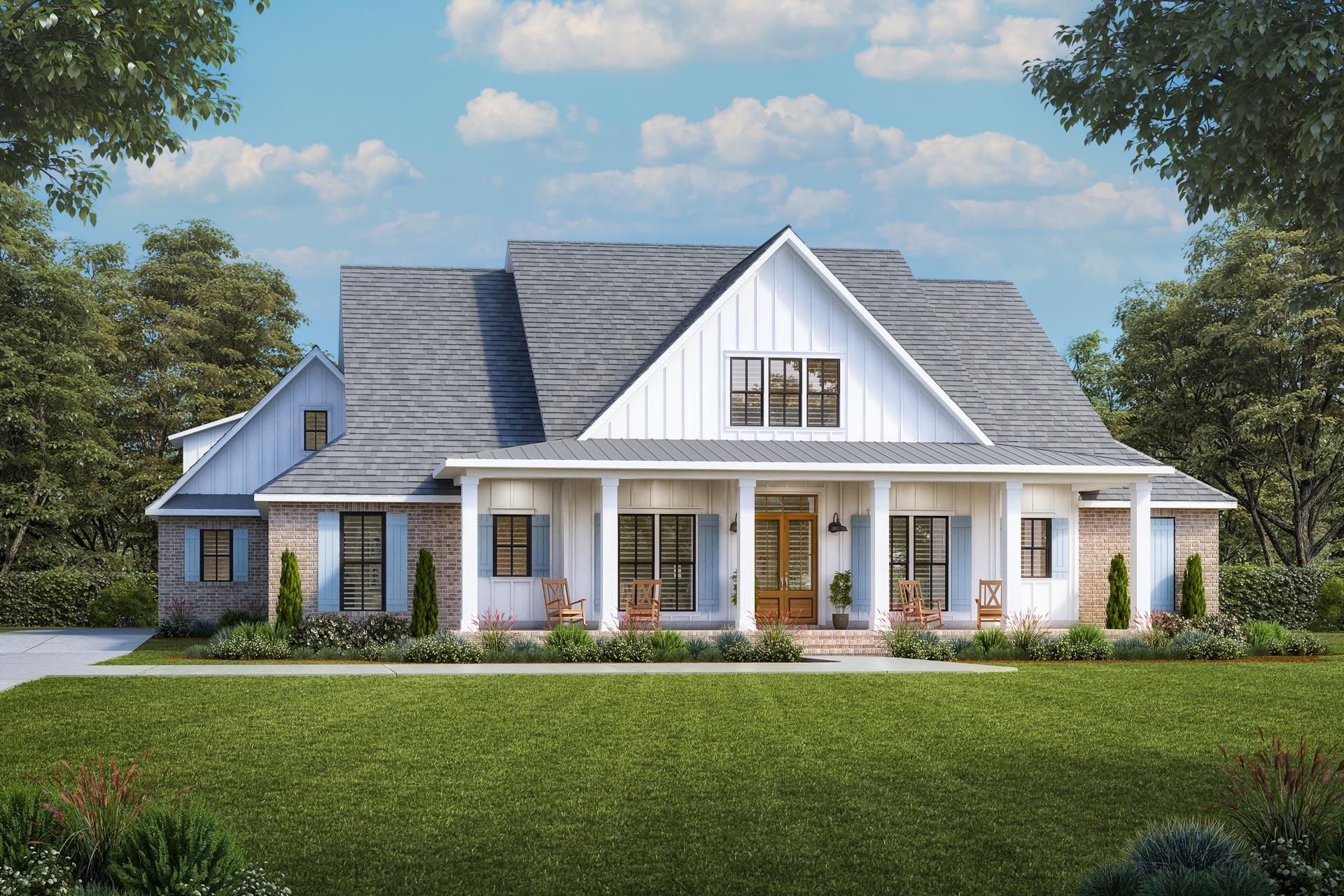 The exterior showcases classic farmhouse styling with board-and-batten siding, balanced gables, and a broad wraparound front porch that welcomes guests and expands your outdoor living space. Generous windows and clean lines give the home both timeless charm and modern appeal. 1
