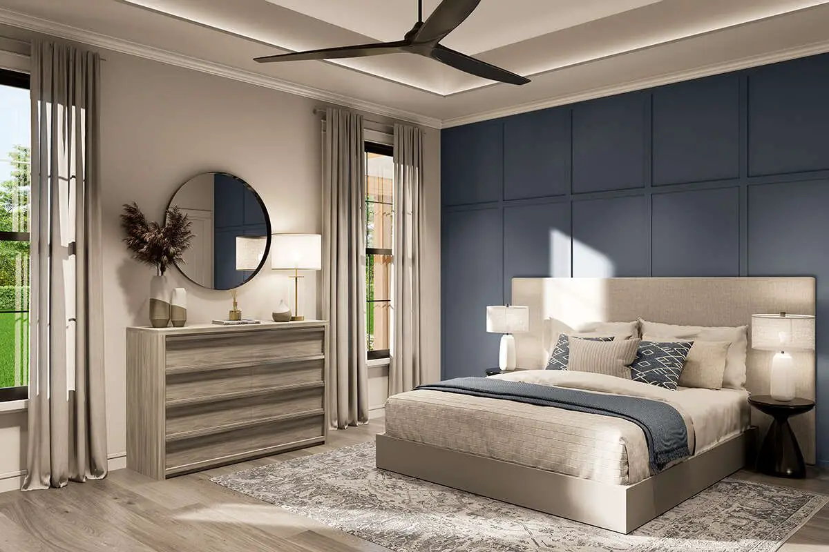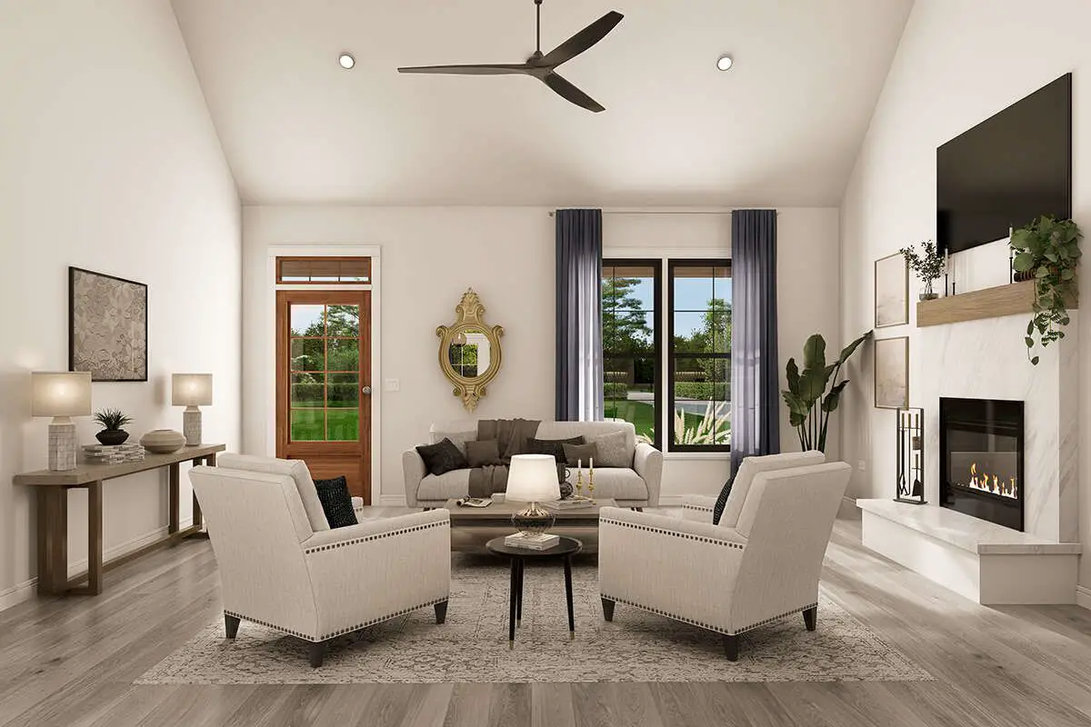 A front-entry 2-car garage integrates seamlessly into the design, maintaining a tidy street presence while offering practical storage and parking.