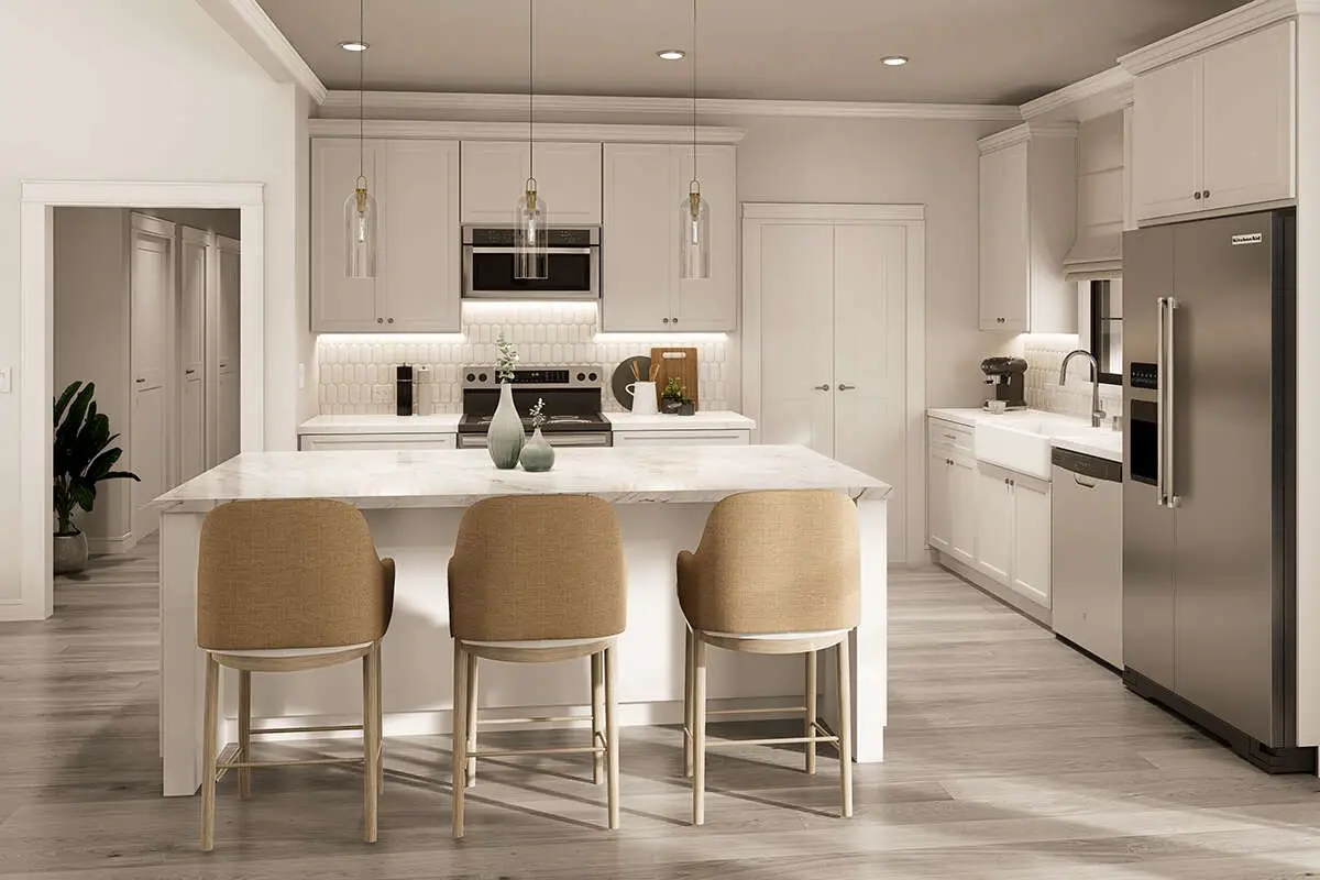The kitchen features a central island, which provides additional counter space for meal prep, casual dining, and social gatherings.