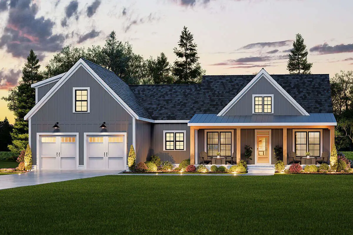 The exterior features classic modern farmhouse elements like clean rooflines, balanced gables, and a welcoming covered front porch that sets the tone for comfortable, approachable style.