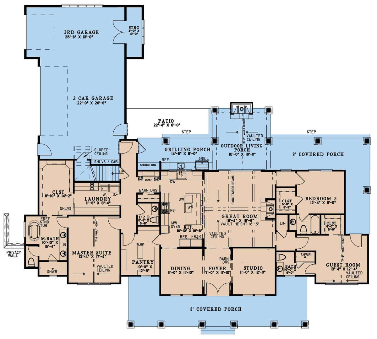 This plan includes three bedrooms. The primary suite is tucked in its own wing with direct access to a luxurious ensuite bathroom that features dual vanities, a separate shower, and a generous walk-in closet—creating a private retreat for everyday comfort.