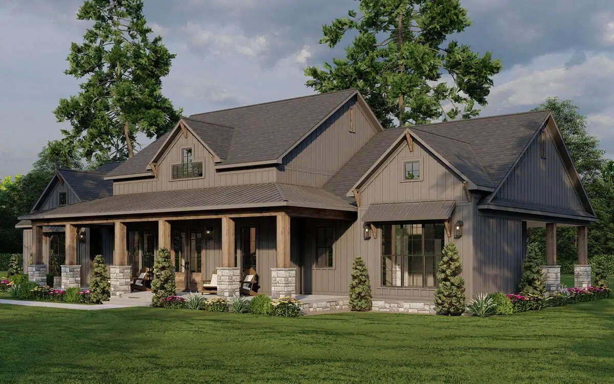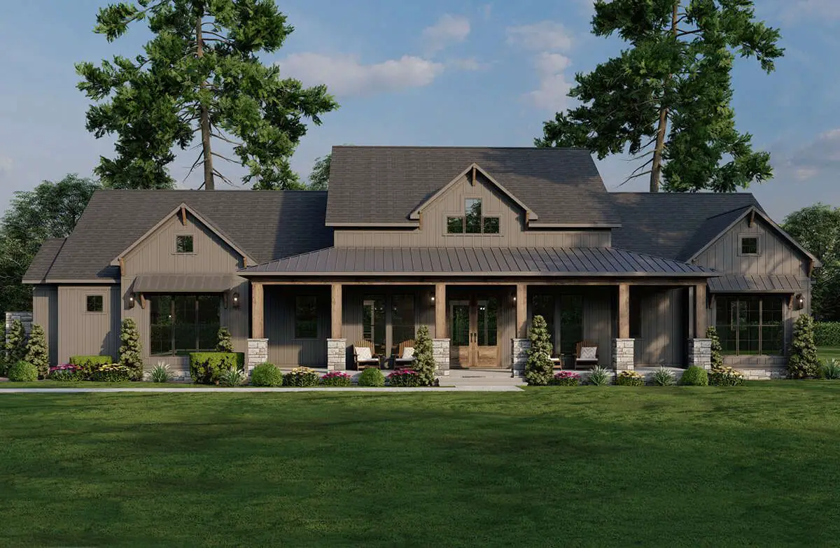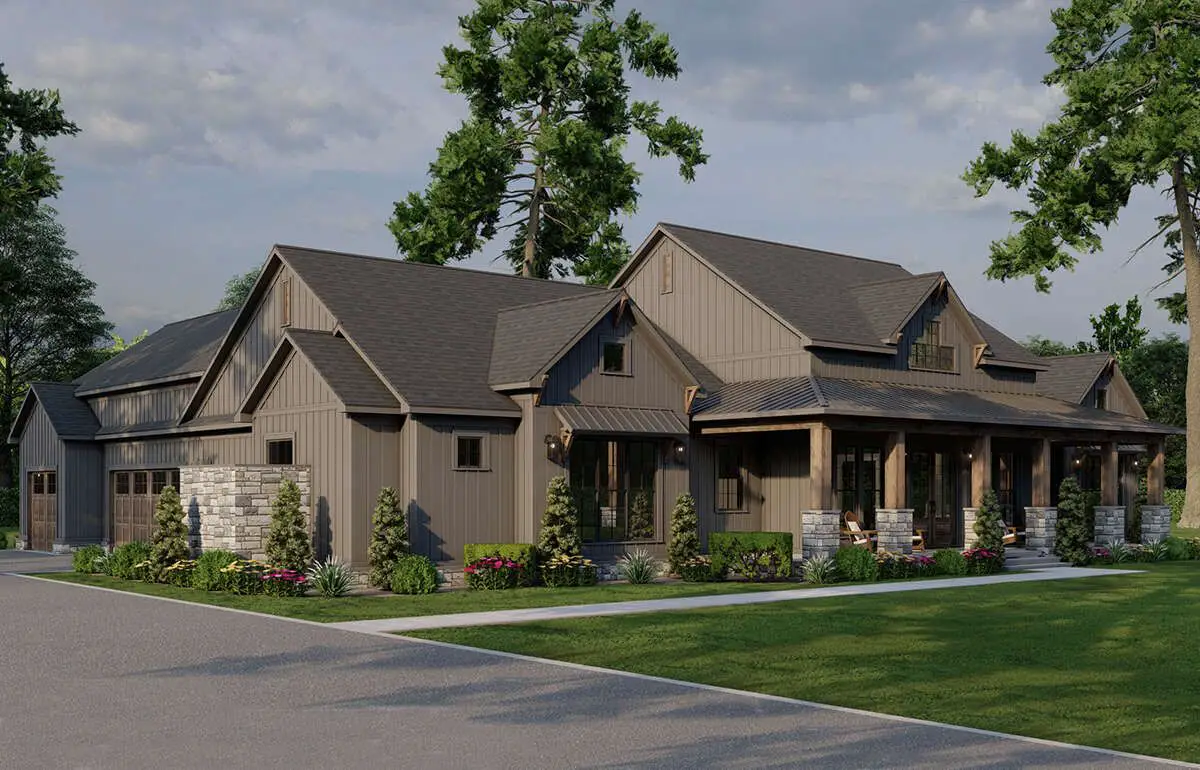 This modern farmhouse plan supports daily family life with open and connected main areas that foster togetherness, while private bedroom wings ensure restful retreats. Ample storage, a functional mudroom, and thoughtful circulation help keep everyday routines organized. Covered outdoor living spaces provide opportunities to relax outside and enjoy fresh air throughout the seasons.