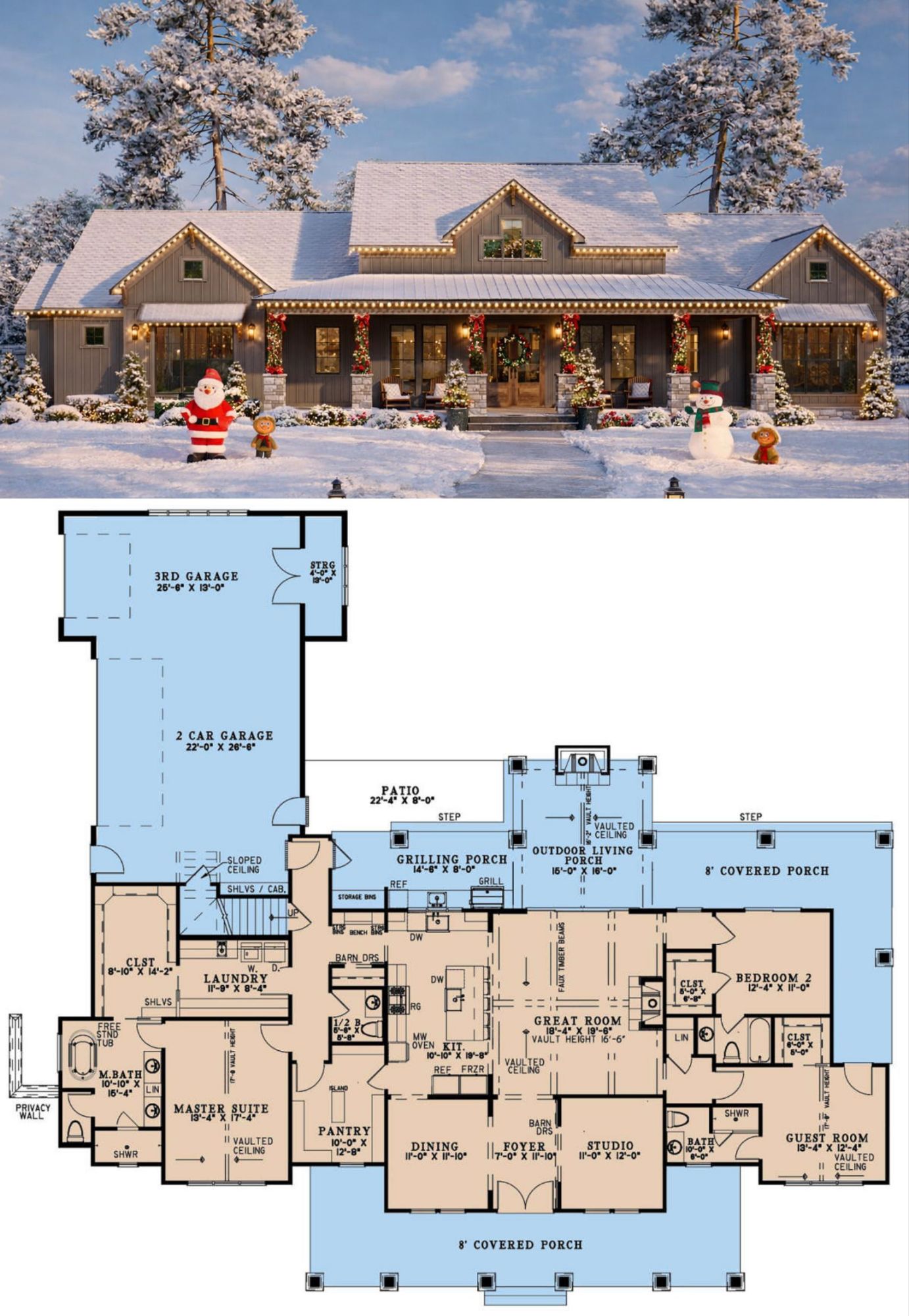 The exterior presents modern farmhouse styling with crisp board-and-batten siding, balanced gables, and a welcoming covered front porch. These elements create classic curb appeal and set the tone for the interior’s blend of form and function. The overall footprint is about 62′-0″ wide by 65′-8″ deep, giving it a balanced presence on a wide range of lot types.