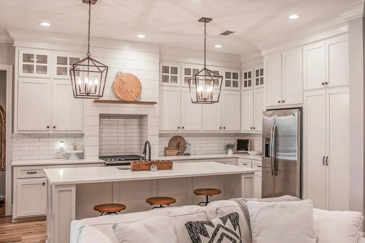 The kitchen features a central island with seating for casual meals and interaction, while counters and cabinets provide ample storage and efficient workflow. Direct access to the dining area and outdoor living spaces supports effortless entertaining.