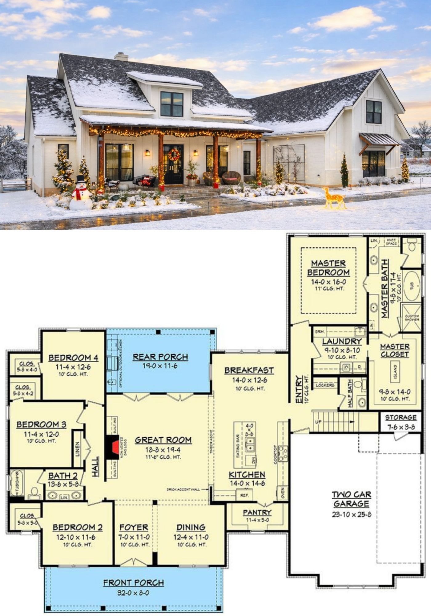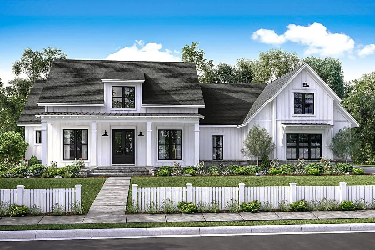 This modern farmhouse plan pairs contemporary farmhouse styling with thoughtful space planning for everyday life and flexible living.