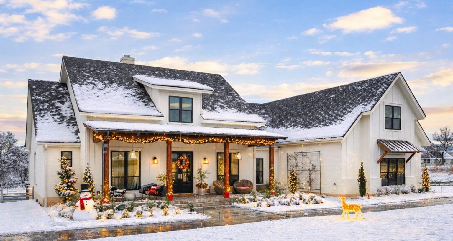 The exterior embraces modern farmhouse character with clean rooflines, board-and-batten siding, and a welcoming covered front porch that enhances curb appeal.