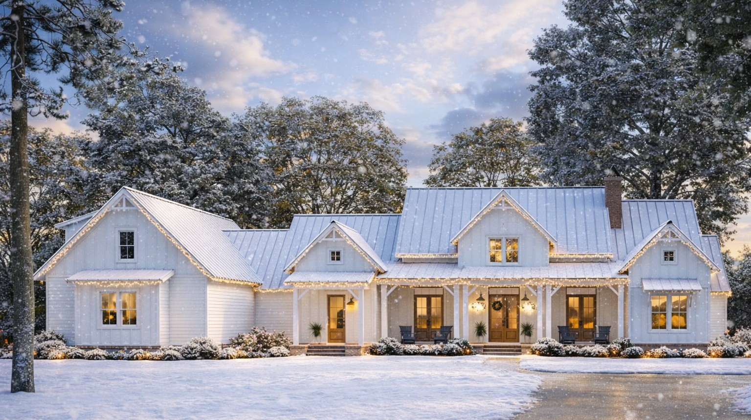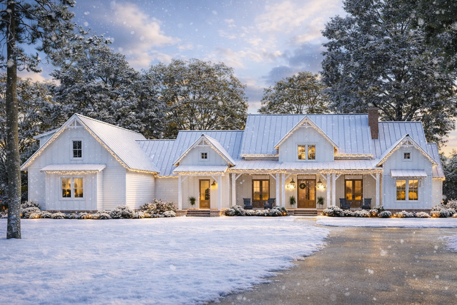 The exterior of this modern farmhouse blends timeless charm with contemporary proportions. The design features board-and-batten siding and a welcoming covered front and rear porch that enhance both curb appeal and outdoor living space.