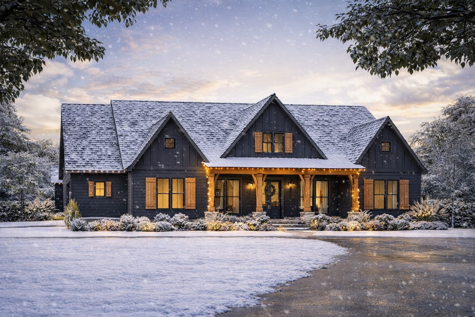 The house presents a classic modern farmhouse exterior with three gables on the front elevation, balanced proportions, and a welcoming covered entry. A side-entry garage maintains a clean street presence and allows functional space for vehicles and storage.