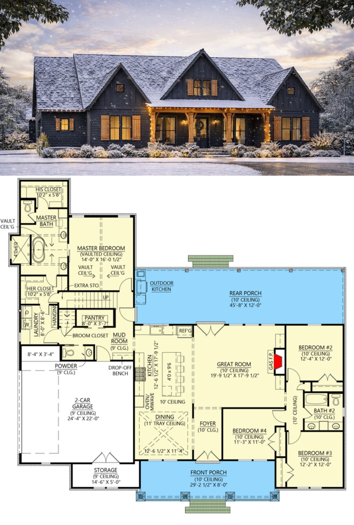 This modern farmhouse plan supports both flexible family living and entertaining. The split-bedroom concept separates private sleeping areas for enhanced privacy, while the open main living spaces encourage connection. The expansive rear porch with an outdoor kitchen and optional game room extends usable space, making it easy to host gatherings, enjoy outdoor meals, or create dedicated zones for recreation and relaxation. 24