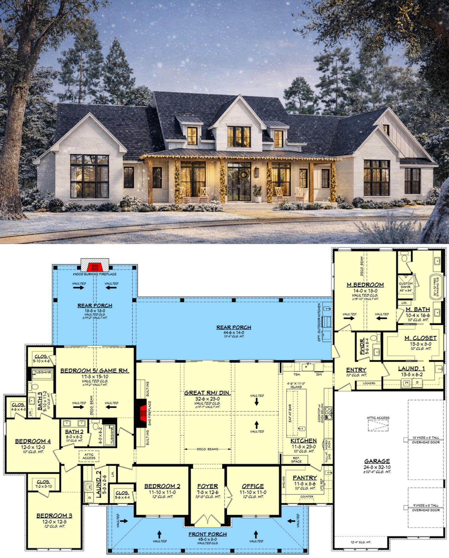 This grand modern farmhouse plan supports both daily family life and gracious entertaining. Open shared spaces foster connection, while private bedroom zones and flexible game or hobby areas provide quiet retreats. The expansive outdoor living area with a full kitchen and fireplace expands usable living space, encouraging year-round outdoor enjoyment. 20