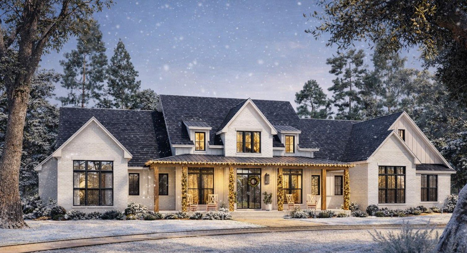 The exterior showcases classic modern farmhouse style with a timeless white brick façade accented by warm timber detailing and clean gable lines. A welcoming covered front porch invites casual seating and sets an inviting tone for guests.