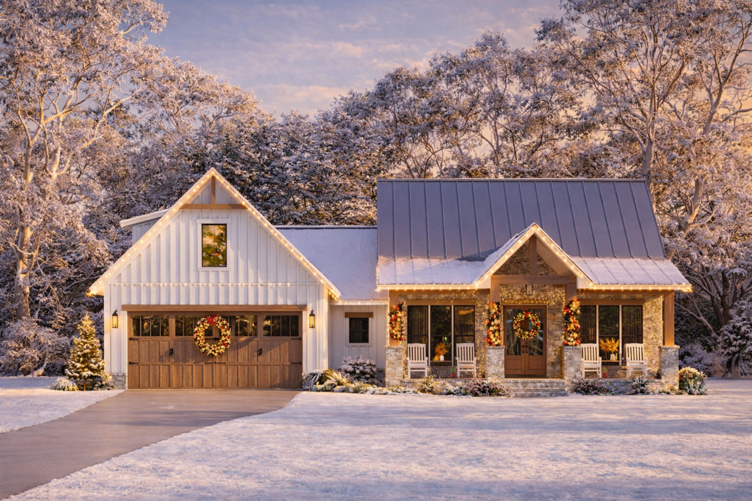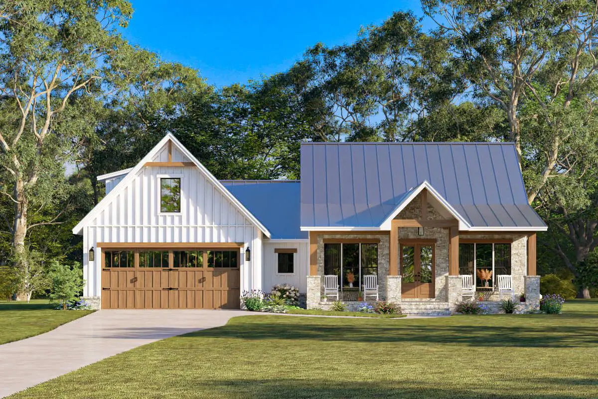 The exterior showcases classic modern farmhouse styling with clean lines, simple roof pitches, and a welcoming covered front porch—perfect for relaxing outdoors or greeting guests.
