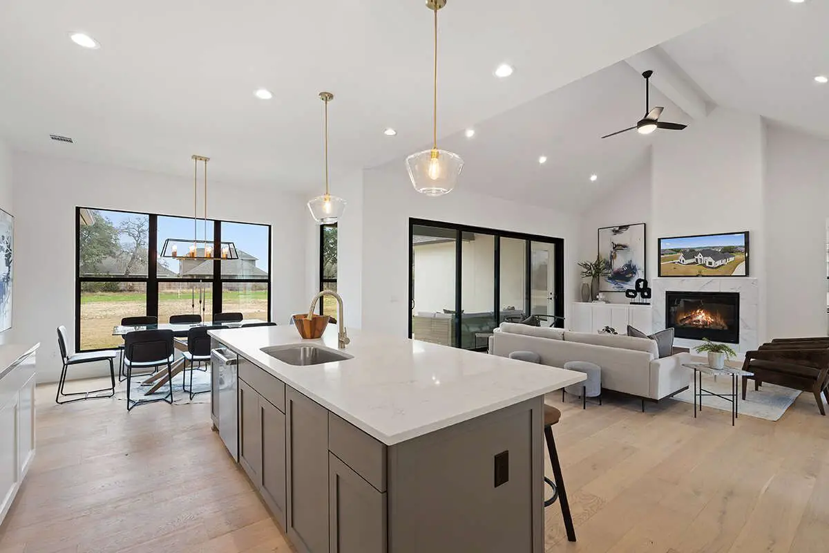 The kitchen layout typically includes a central island and ample cabinetry, offering a balance of workspace and casual gathering space for family meals or entertaining.