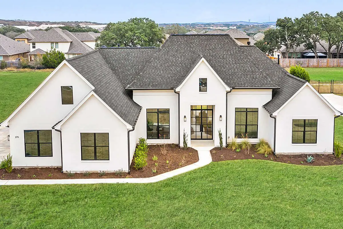 The home’s exterior showcases classic European style with refined rooflines, a balanced façade, and a covered porch that enhances curb appeal and creates an inviting entrance. With dimensions of roughly 77′-10″ wide by 77′ deep, this plan maintains a strong and elegant presence on a sizable lot.