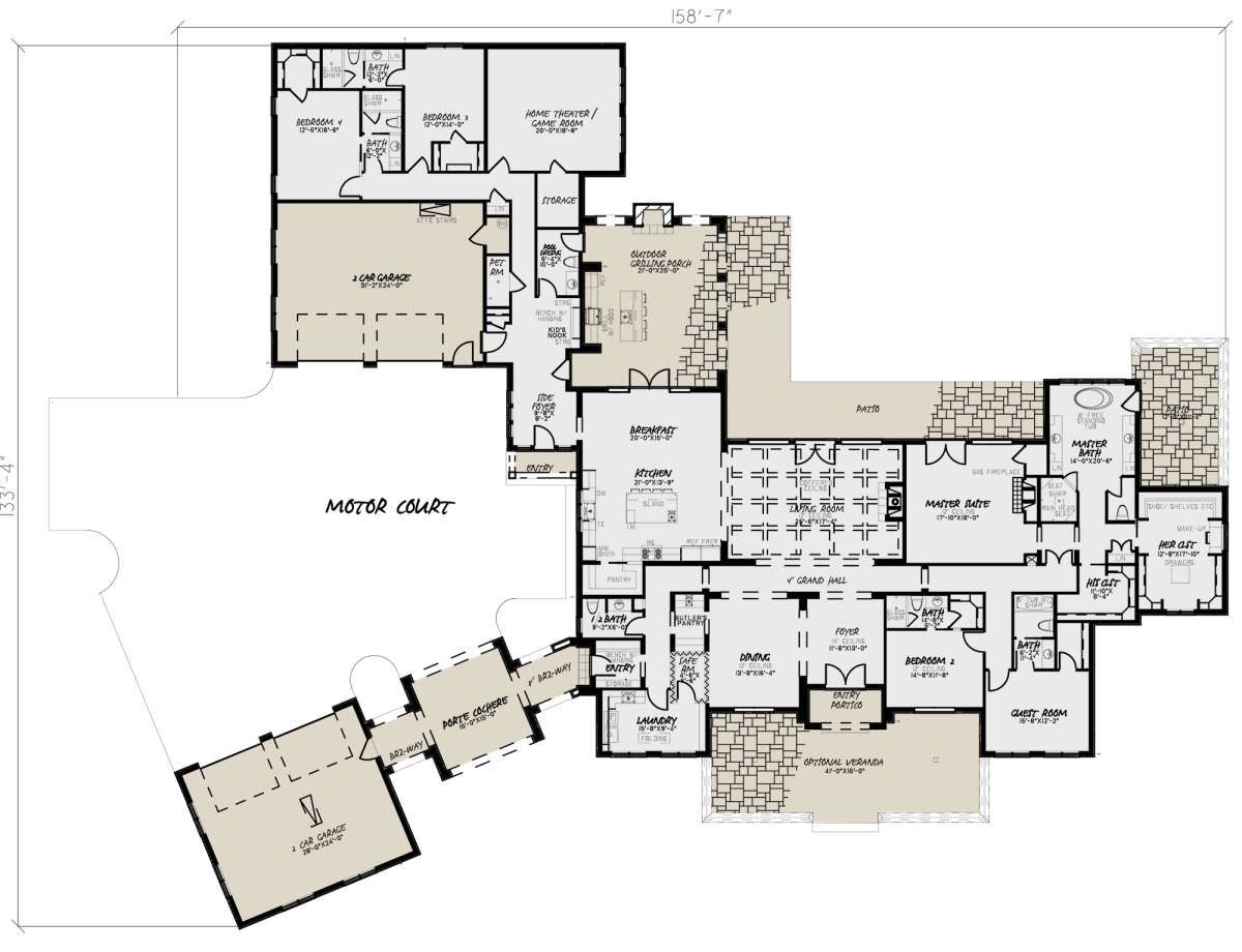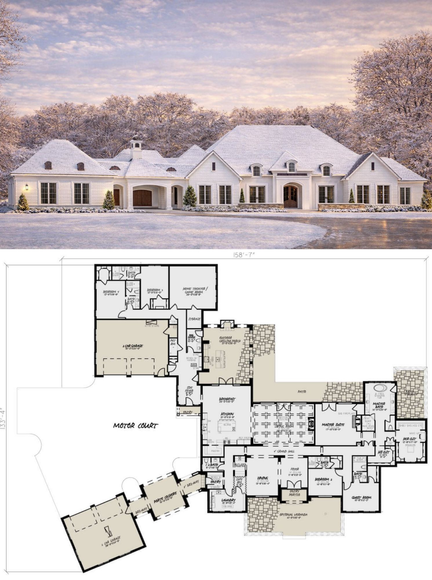 The curb appeal of this European plan is striking, with a wide and balanced façade spanning about 158′-7″ and a depth of 133′-4″.
