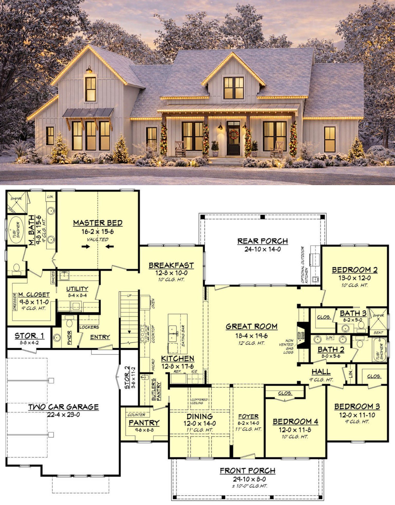 This attractive **Modern Farmhouse Plan (#041-00169)** blends classic farmhouse styling with a smart, flexible layout designed for modern family living.