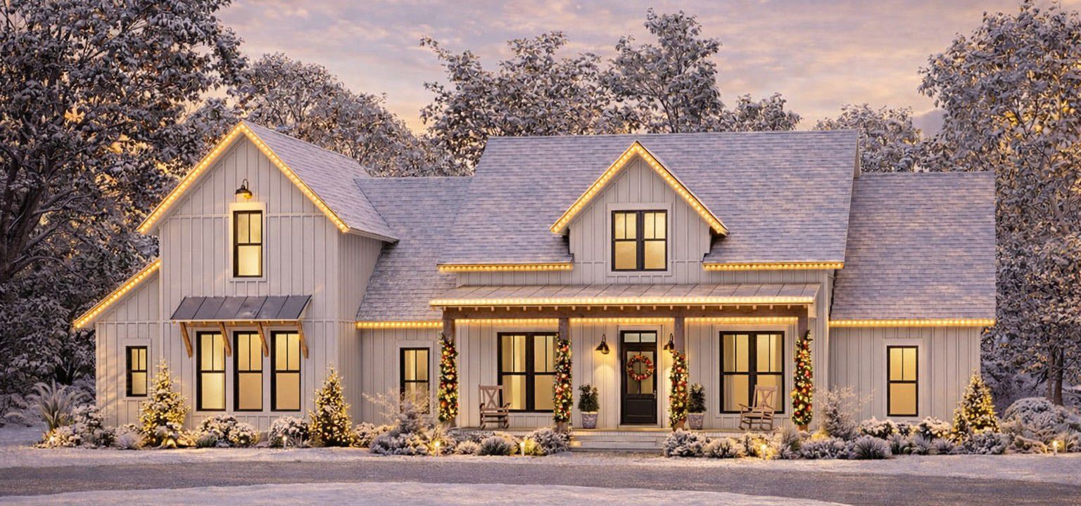 The exterior presents timeless modern farmhouse charm with board-and-batten siding, clean gable rooflines, and a welcoming covered front porch—the perfect spot for relaxing outdoors. With a footprint roughly 76′-8″ wide by 61′-10″ deep, this home fits well on a variety of residential lots. 1