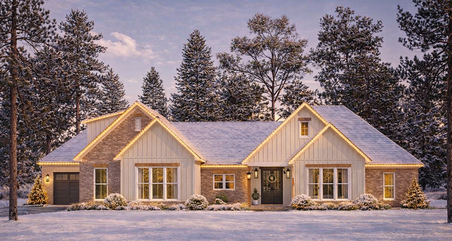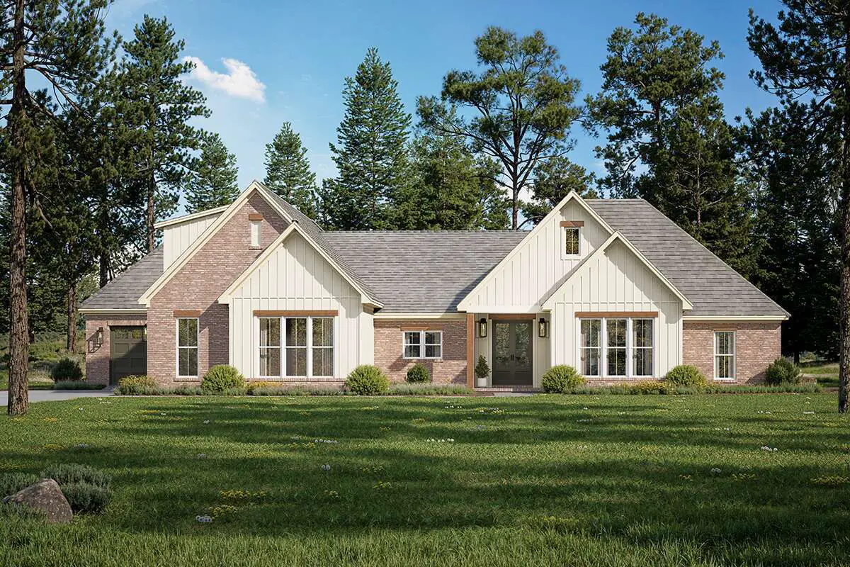 The exterior showcases timeless modern farmhouse style with clean lines, balanced gables, and a welcoming covered front area.