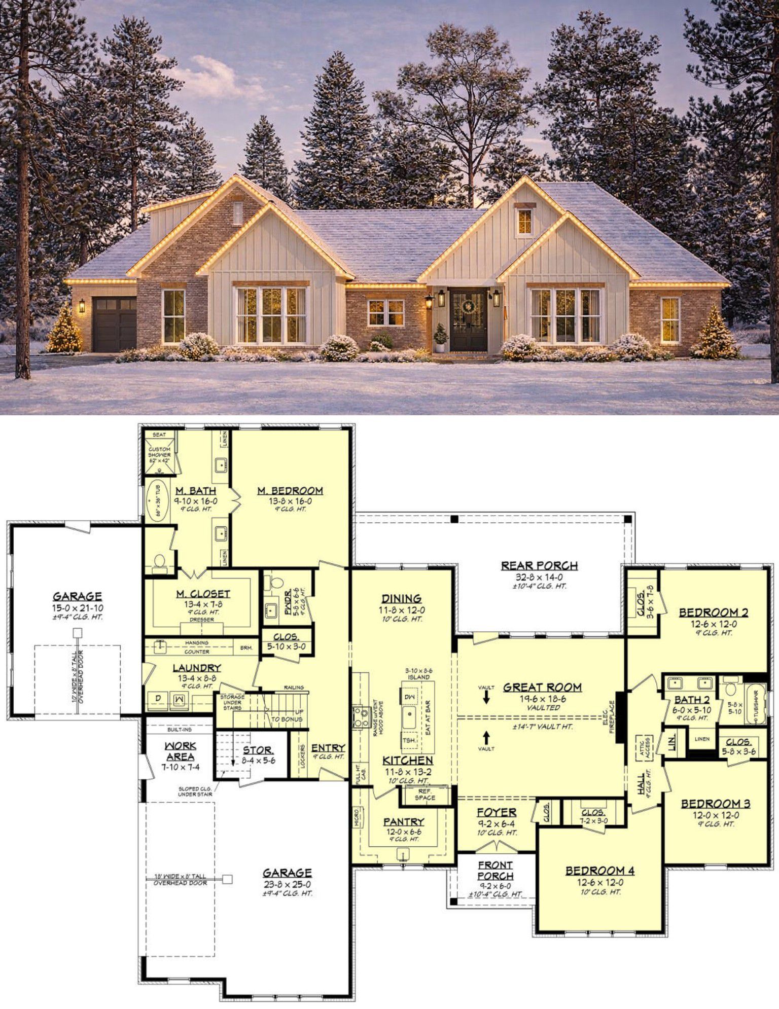 This appealing **Modern Farmhouse Plan (#041-00407)** offers a spacious and versatile single-story layout that blends classic farmhouse charm with contemporary living spaces.